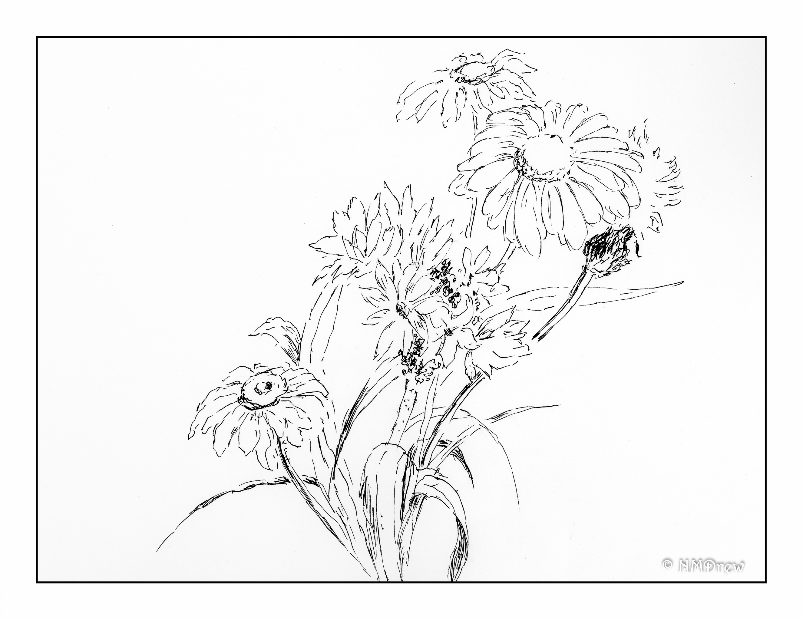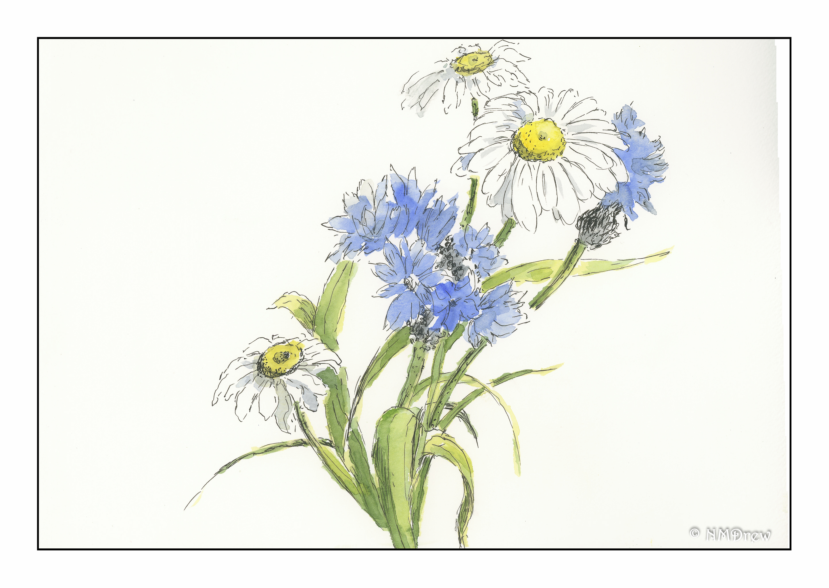 I thought about a daisy study of Peter Sheeler’s on YouTube – I remembered how very little color he added to his ink drawing of the daisy. With this in mind, I put in some greys and grey-blues. I tried to apply the same concept to the blue flowers (which I want to call cornflowers, but don’t think they are), and to the grasses and leaves. Below is my ink drawing, done freehand without a pencil sketch beforehand. I am rather pleased with both – my inking skills are improving, as, perhaps, are my watercoloring skills. Less is more has become more of motto than before!