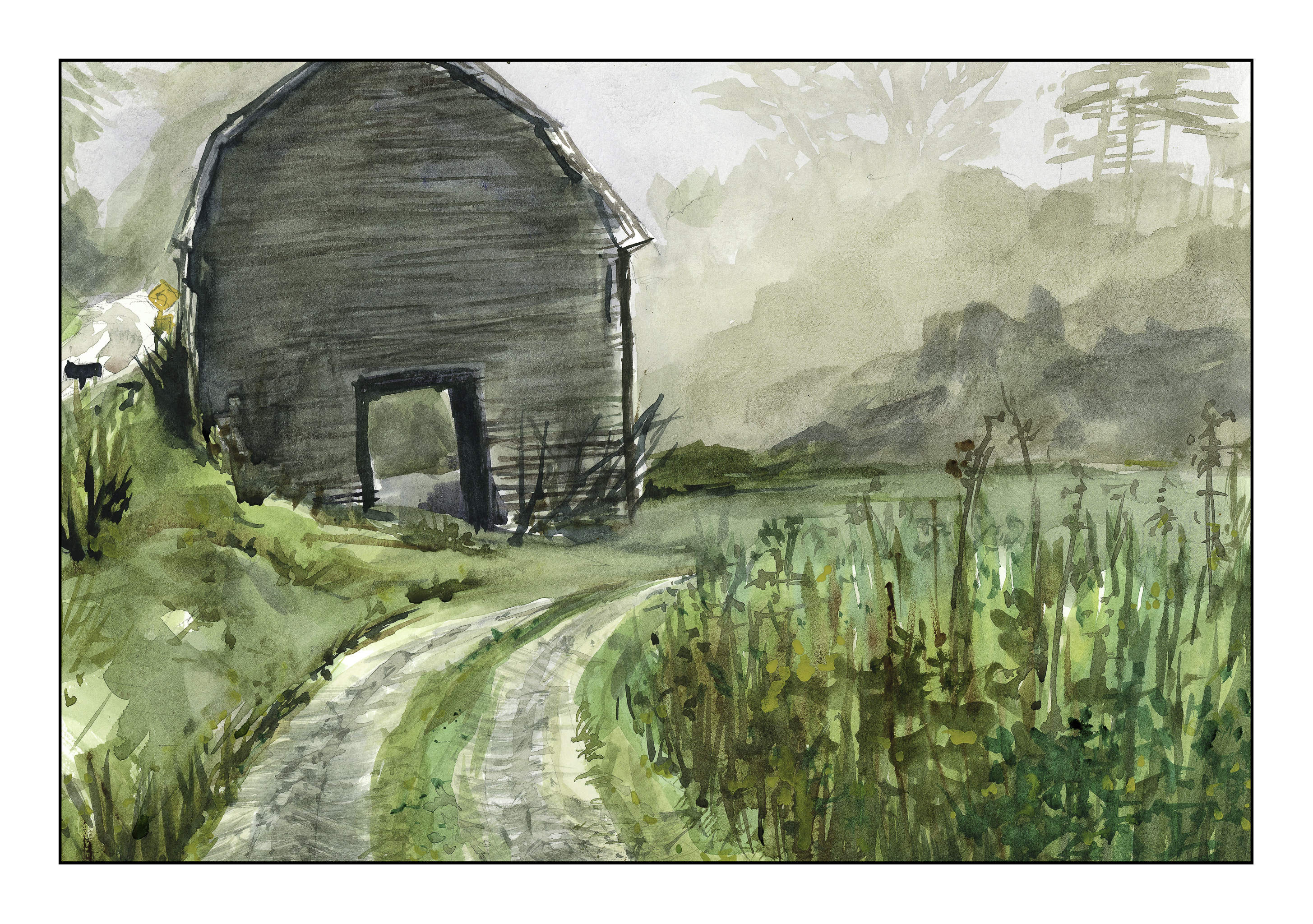 This final painting was a serious challenge. The paper I was using for all of these is student grade, so washes are tricky and often become hard edged or have blooms. I solved a lot of those problems by scumbling along the edges; this was good for softening, blending, and blurring the edges. I also used a 1-inch flat brush for the majority of the painting, forming the blurry vegetation, to the barn, to the road. Only when I added detail did I use a small brush, specifically a rigger. While I don’t think this painting has great perspective, the goal of atmospheric perspective was met. I used to the left and right of the barn, as well as with the weed patch on the lower right.
