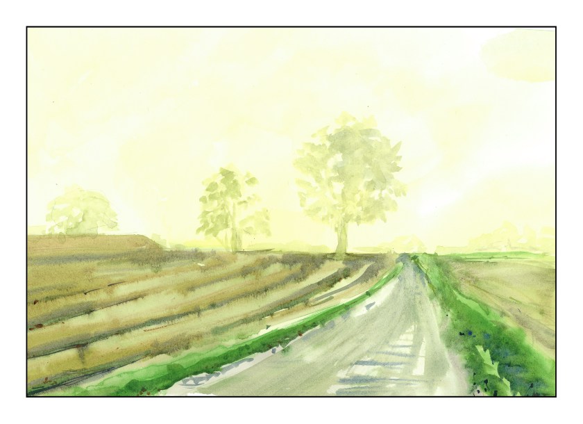 Her is a study on distance and fog. The image was mostly green and yellow in cast, The sun is peeking between the two center trees. The tree shapes show lighter in the painting, as the do in the photo, but I think I could have done a better job with the sky to emphasize this point. To show distance, I tried to make the further objects more simple and cooler, while working at a bit of detail and warmer values for those closer to the viewer. Perspective was indicated by the road narrowing and the curve of the furrowed field.