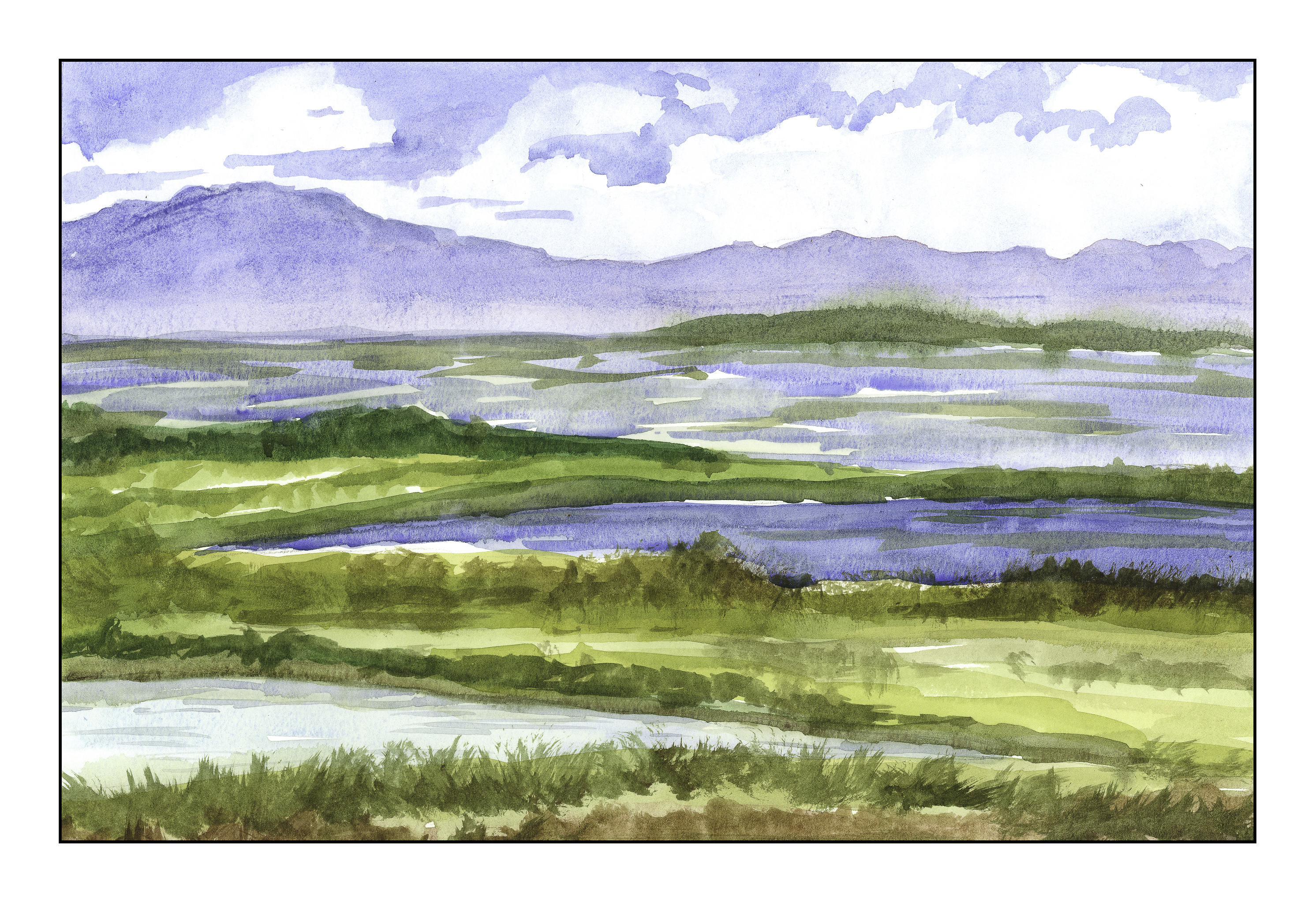 What I liked especially about the picture was the haze at the base of the mountains and the blurred quality of the green hill. In the photo, it was less distinct. From there, I tried to paint the values I saw, so the distant water was a midtone, the middle water dark, and the closest the most pale. I also made the mountains more blue and violet and tried to use warmer colors the closer to the bottom of the page I got. It worked to a degree in varied areas, and not in others. Still, having 3 different values of water was rather interesting.
