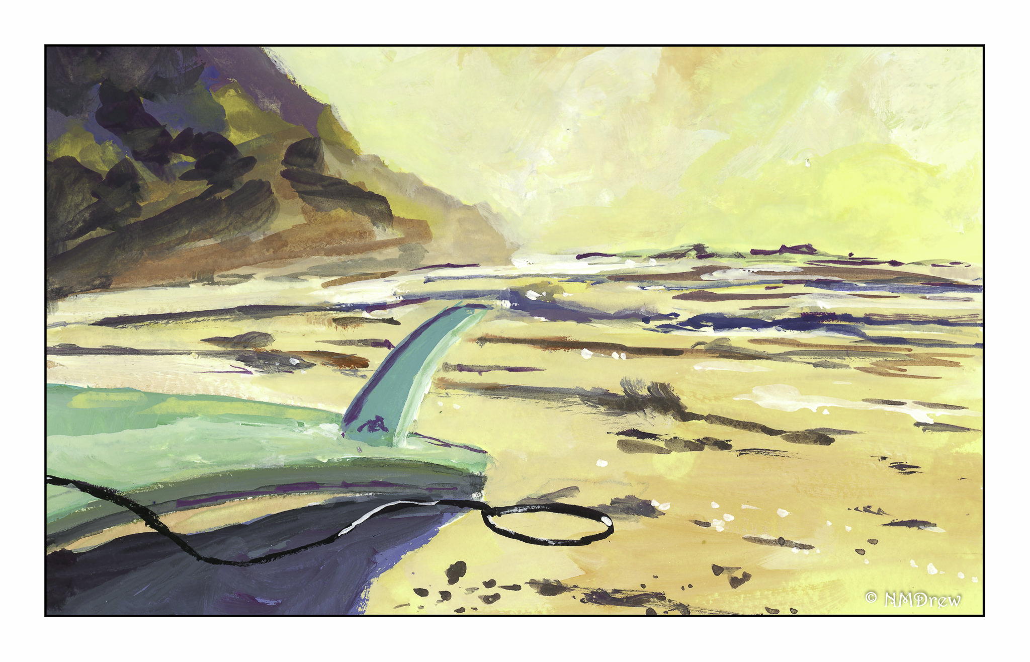 This one, I will say, makes me feel pretty good.  I like the surf board and the highlights on the leash.  As well, the foggy sky with the sun breaking through is a far cry from my usual blue skies.  Overall, the atmosphere is good for beach fun, I think.