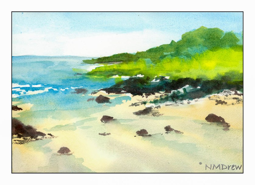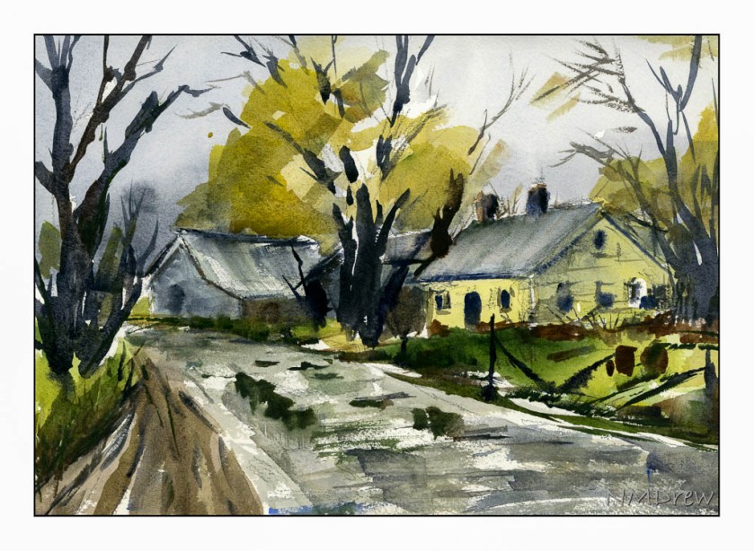 Now we are moving into big time! Here, five colors. Payne’s grey, ultramarine blue, aureolin yellow, Hooker’s Green, and burnt umber. Another study from Ted Kautzky.