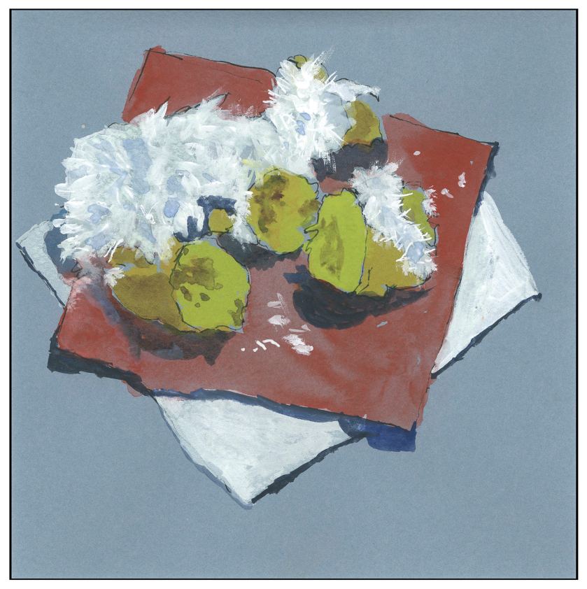 Here, simply color shapes to imply a flower or a leaf. My experience in sumi-e brush painting makes my understanding of controlling a brush – even an inexpensive water brush with nylon bristles – much easier.