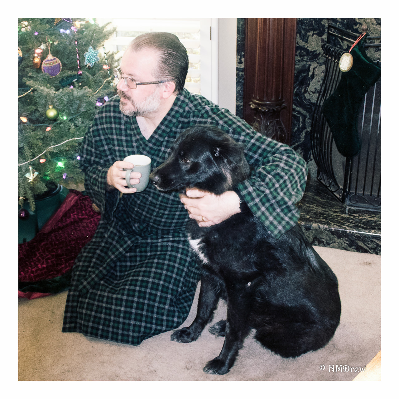 And speaking of “woof” – here is the Master of the House with Smudge, a Mistress of the Canine Guard. Please admire the modesty of the pose, the fine fire guard, Italian marble and mahogany fire place, and decorative tree, along with my fine photography skills.