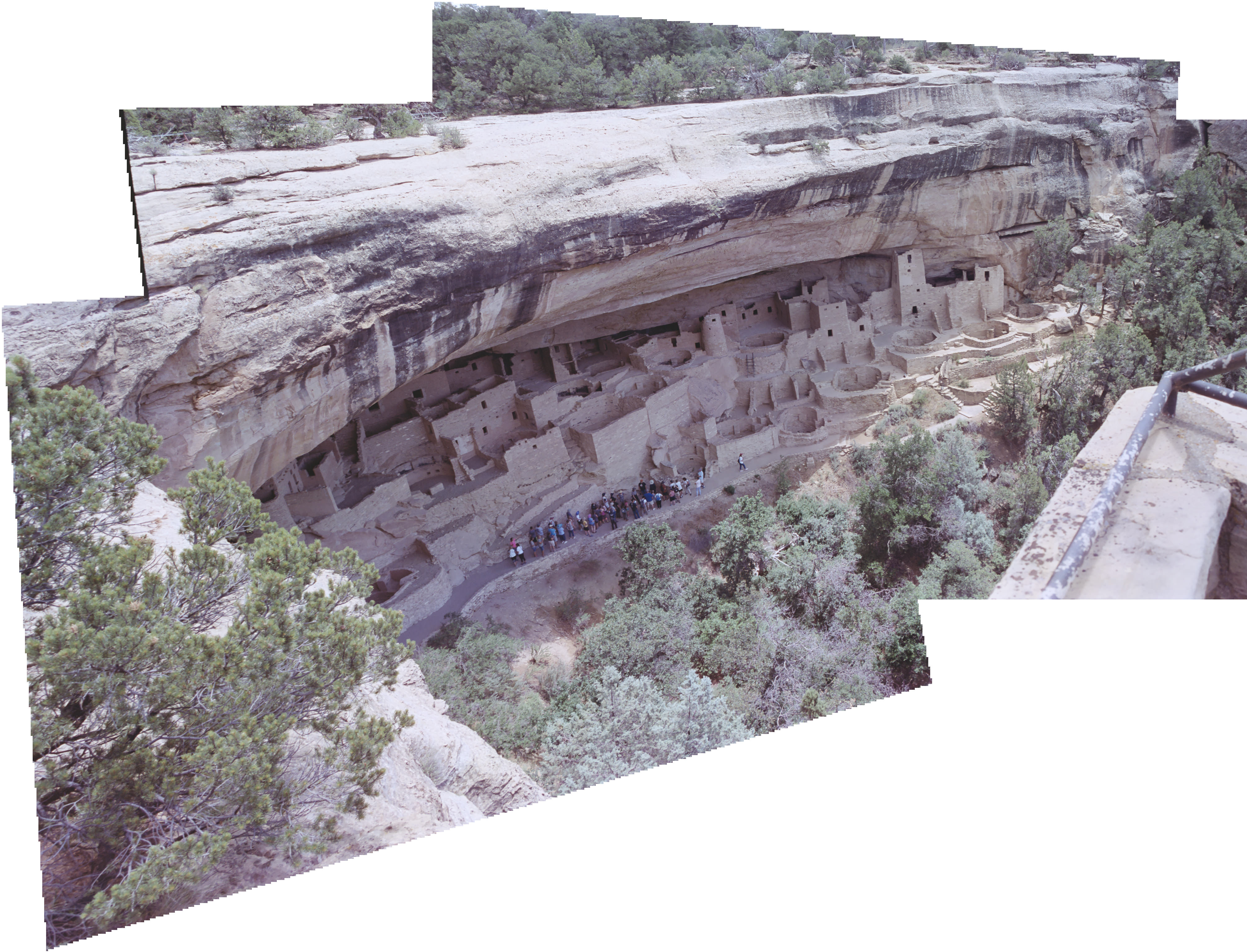 Today is an uncropped panoramic film image of Cliff Palace in Mesa Verde National Park. We were here in July-August of this year, and not in the best of shape for a crawling / climbing tour of this remarkable cliff dwelling. Instead, as I’ve done before, I leaned over the edge of a balcony built high above and took my pictures.