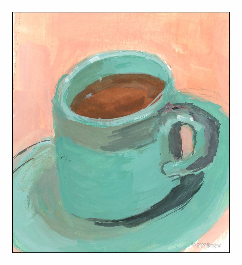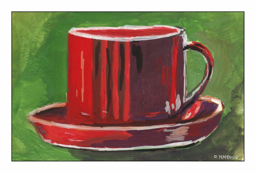 - The second coffee cup is red (with some orange) so I used greens, but thought shadows looked better with some violet and deep blue added, with a smidge of black.