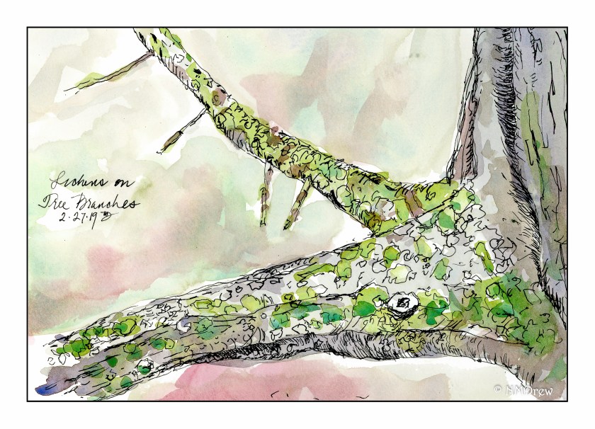 In today’s gloom, the bright green lichens on this tree caught my eye. I’ve photographed it a number of times, in different seasons, under different lighting conditions. There are spots of green, white, and dark grey. Textures range from smooth to rough. In the textures of the garden – leaves, flowers, critters, stems, branches, – it is easy to overlook the subtle beauty of a couple of branches.