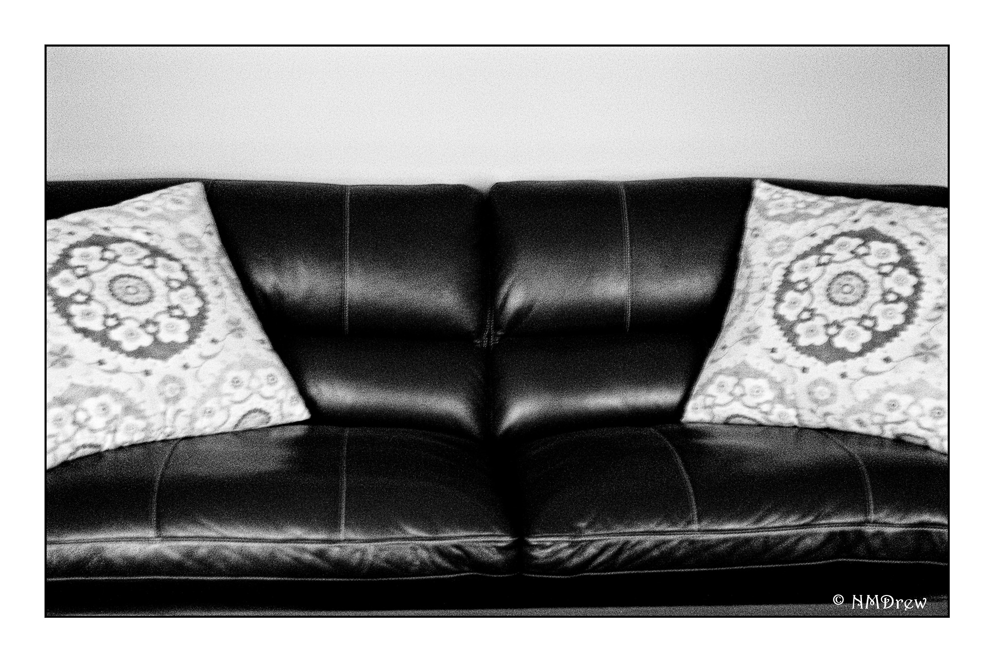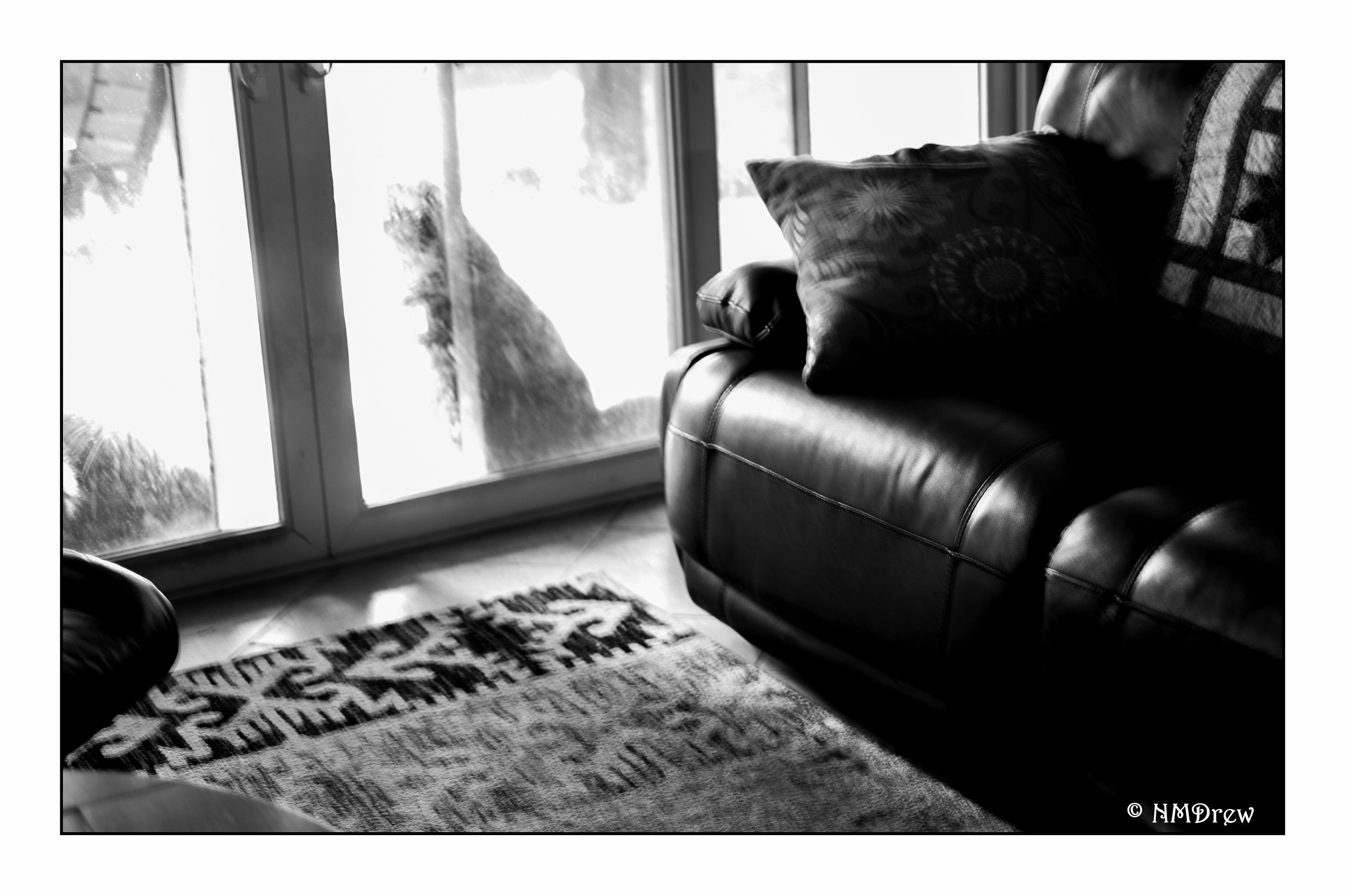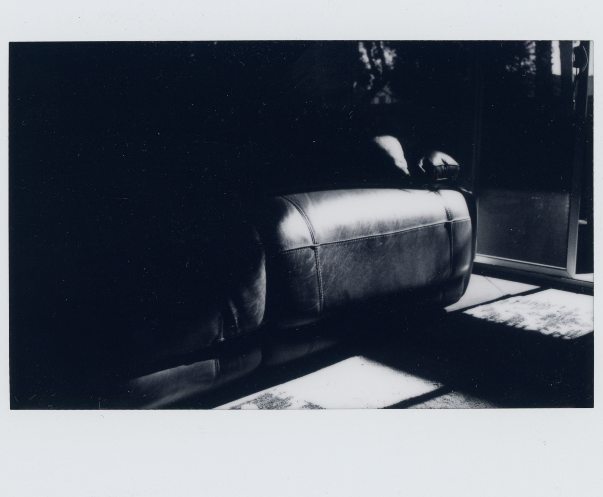 Another instant photo taken with the Instax Wide 300. More monochrome film (why don’t they just say “black and white”?). No flash, and no flash cover. Instead I judiciously placed the center of the lens – there is a circle you can use to set up your image – on the bright left corner of the couch. Here it is, straight from the camera’s whatever. This one I like.