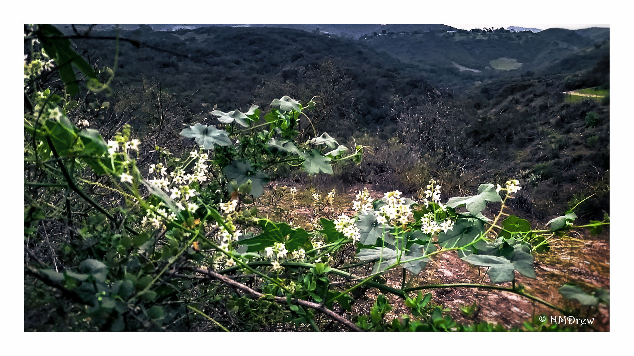 I took my old beat up Nikon FM2N with me, and a roll of Provia 100, and a 28mm lens from 1970 or so. It does close ups, too. I am looking forward to seeing what comes from the roll, as it was dreary outside, and the light in the late afternoon was not good. I also brought my phone with me, partly for a potential emergency – hiking alone – but also to capture an image or two that might be worthwhile. So, above, is a picture taken last night before I turned to go home. The rains bring new growth, the first of which is this lovely white-flowered wild cucumber.