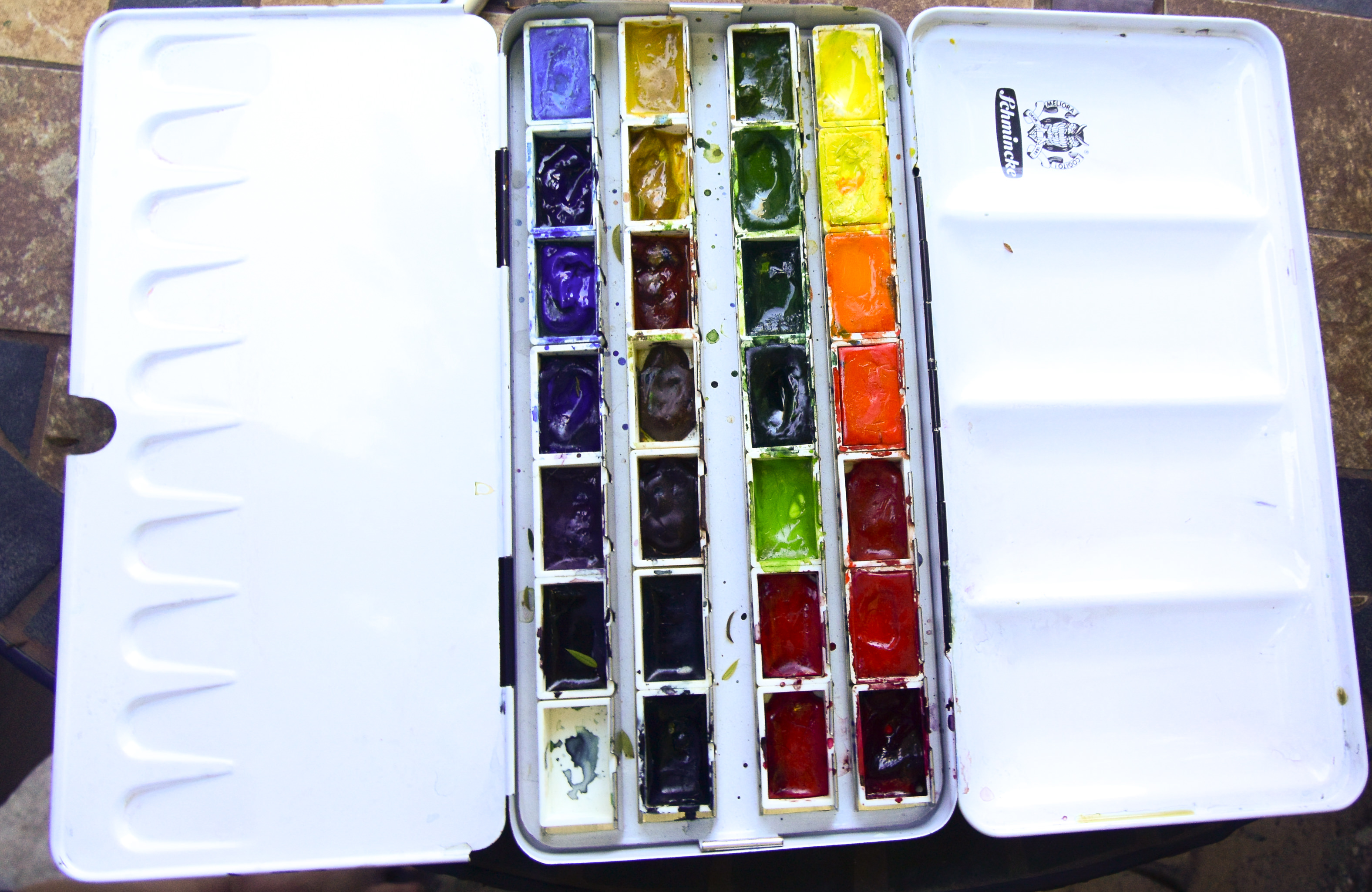 Quality paper is a must-have. I have some tablets that I bought which I absolutely hate because of the texture and sizing in the paper. However, I used them up and ordered more of the Canson’s Montval paper, in a spiral booklet form, 9×12 with 20 pages. It’s a good working size – and it’s good paper, with a nice texture and sizing which doesn’t blotch up and look horrible. It’s also very reasonably priced. The Schmincke paint box may have Schmincke paints in them – or not. My paint supplies include Schmincke, Winsor & Newton, Daniel Smith, Holbein, and M. Graham professional-grade watercolors.