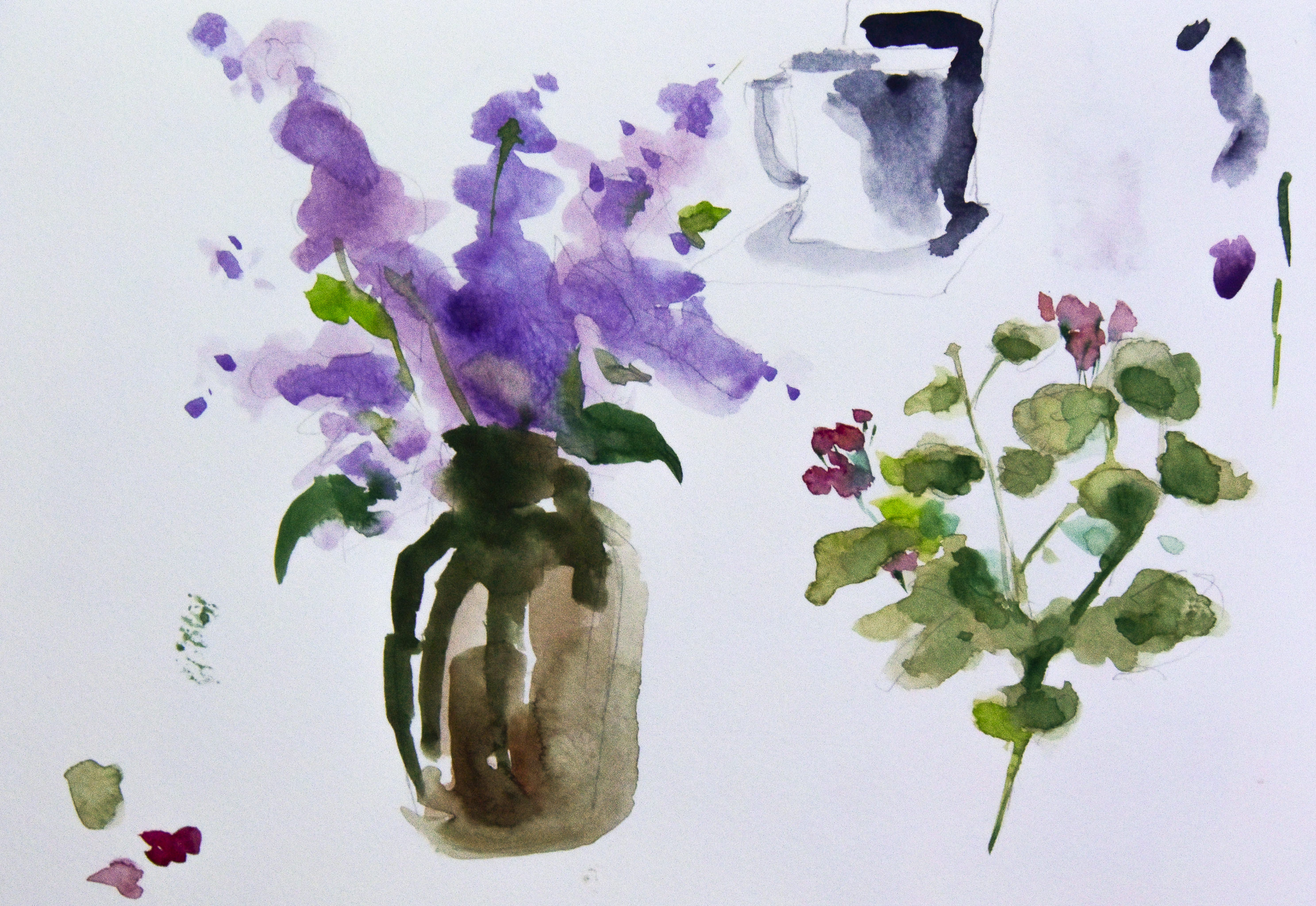 This was a quick study, more white space being left open. I went back after I finished this study to use my pencil to add some shape to the white flowers. I like lines – and it is a problem I find with my own sense of a “successful” painting – I need lines to define things. Sometimes lines work – sometimes they don’t – but I do love the Renaissance ink studies I’ve seen, and lines have always held my eye. Lines are expressive – but so are shapes of color.