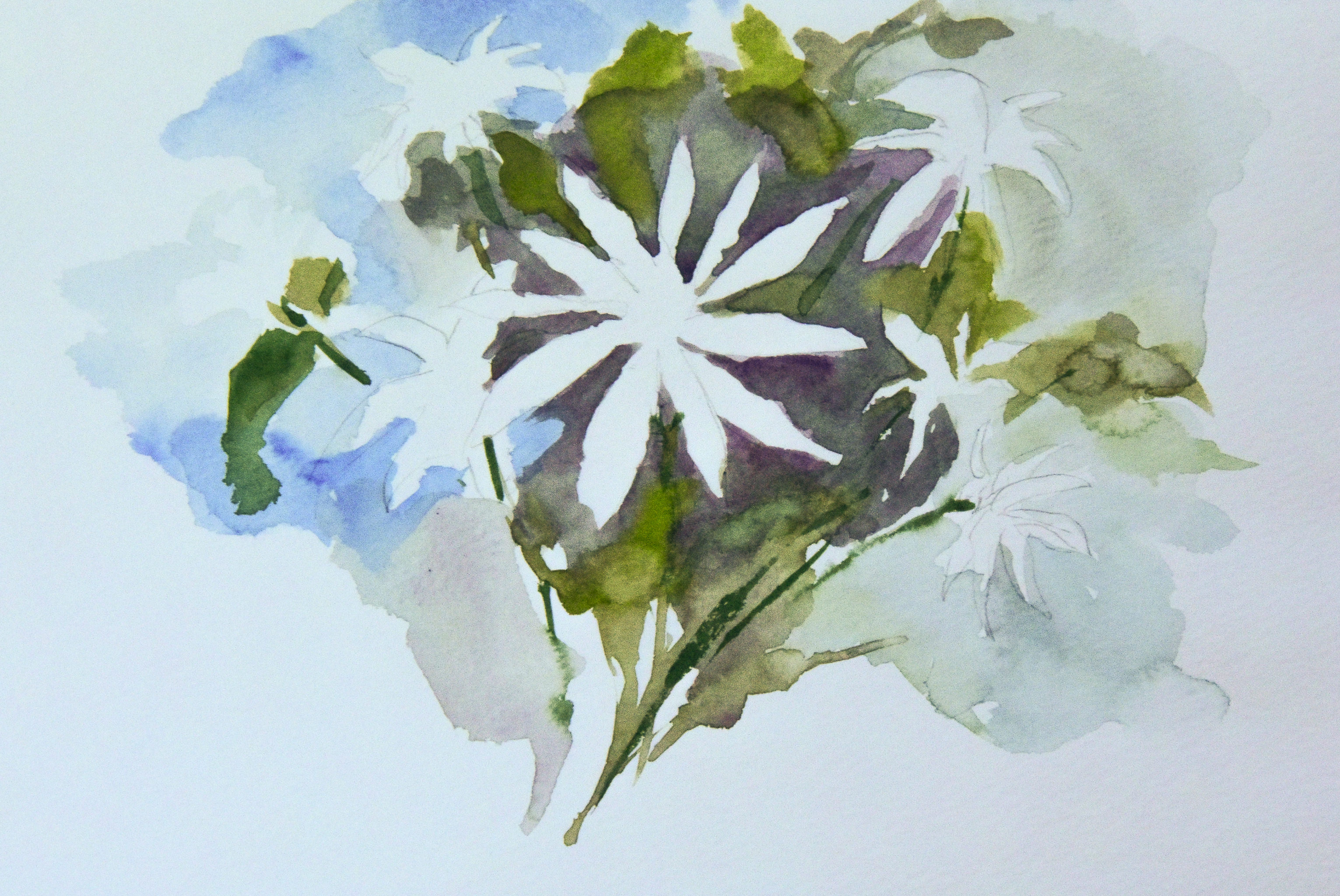 Here, simply color shapes to imply a flower or a leaf. My experience in sumi-e brush painting makes my understanding of controlling a brush – even an inexpensive water brush with nylon bristles – much easier.