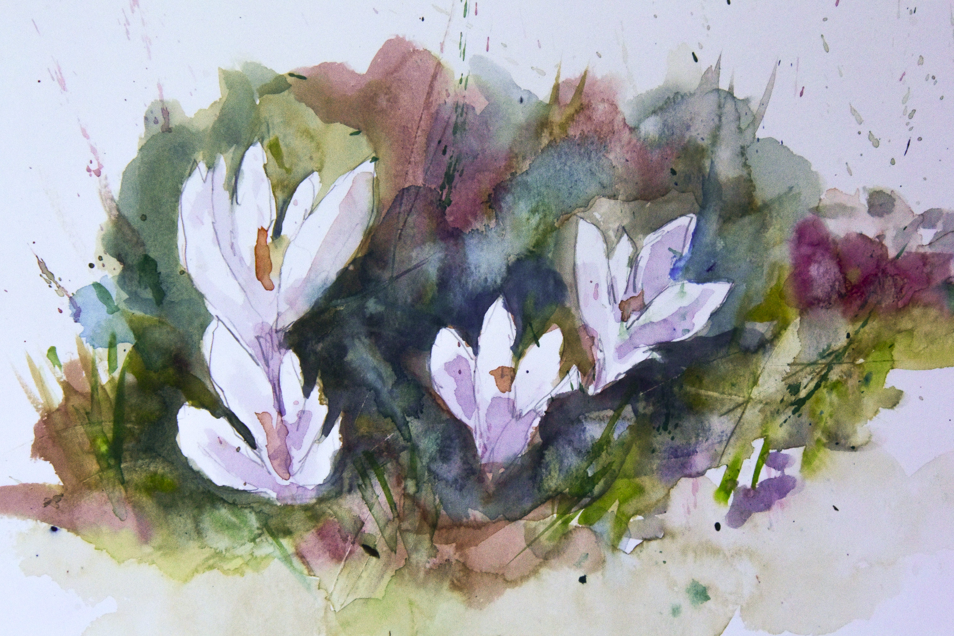 Well, I did succeed somewhat. The crocuses above are one of Reid’s studies, and I was pretty pleased with it. In reality, it doesn’t look half as good as the photo, but then it is on a piece of messy paper with scribbles on it and test swatches of color.