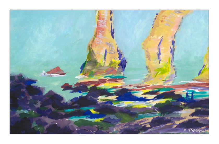 For some reason the works of Claude Monet have been rolling around my head, in particular his studies of the cliffs at Etretat. I found that he has done many studies of this place – it must have been a favorite of his. The above gouache was inspired by his version from 1885, Study from Etretat, the Manneporte, Reflections on Water.