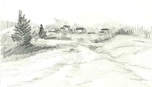 Following through on points for some of the classes I have been taking, I am working to simplify subject matter, colors, and lead the eye. I think I managed to do this here, leading through the fields to the houses on the hilly horizon. I tried to contrast warm and cool colors, with a bit of warm on the buildings with the hope it will draw the viewer in. I also used wet in wet and dry brush, working from general shapes to more specifics; light to dark in general.