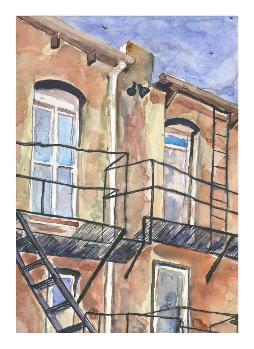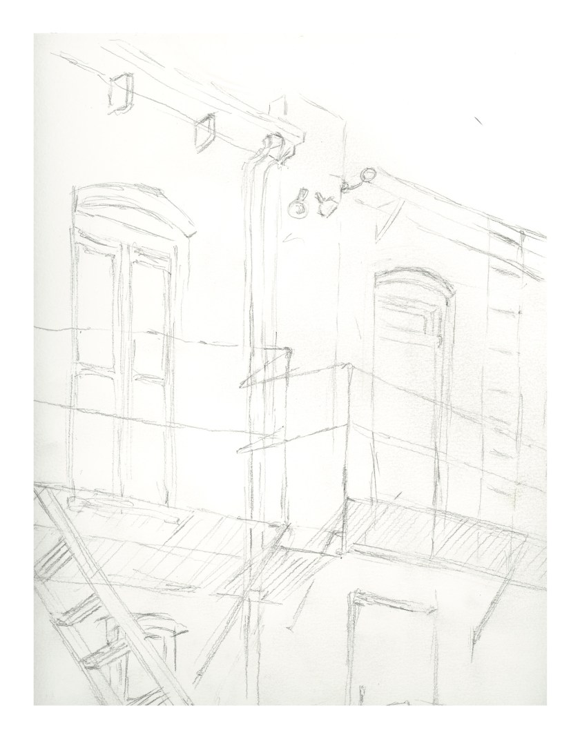 From our trip to Flagstaff this summer. Below is the original photo, to show the color and the actual image. I think it might be behind the Hotel Monte Vista, from the parking lot, but I don’t remember. Anyway, some artistic license. I actually was planning to do the entire photo, but once I started my sketch, from the top left building, it soon became apparent that my proportions were totally off, and ended up with the upper part. However, I think the fire escapes are actually pretty interesting, and are a strong point in the drawing, as are all the lines of the pipes and landings and stairs.