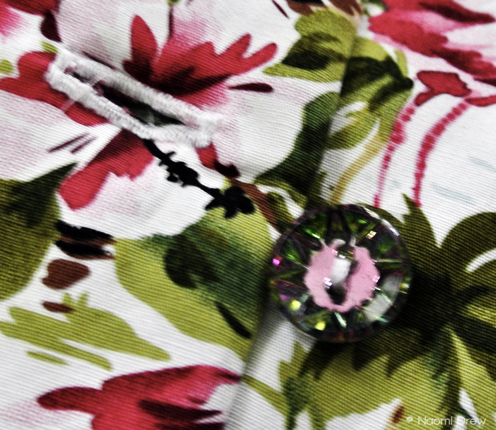 How many of us have ruined something through inexperience, fatigue, or impatience? For me, buttonholes have always been a point of sheer frustration, and the cause of a garment in ruins. Consequently, I often have made loop buttonholes instead of ones cut into the fabric. To conquer this, I pulled out all stops – I have my old Singer buttonholer with the bight and width adjustment. I also have a clamp-on for straight stitch machines with templates. I have another clamp-on with templates for use with zigzag machines. And finally, my high-end Janome MCP 6500 has a buttonhole attachment. In the end, I decided on the latter, and practiced making buttonholes. I think I made fifty or so. But, the blouse does have buttonholes on it that I do like, but the reverse side always looks better to me . . . maybe I’ll just do them upside down next time.