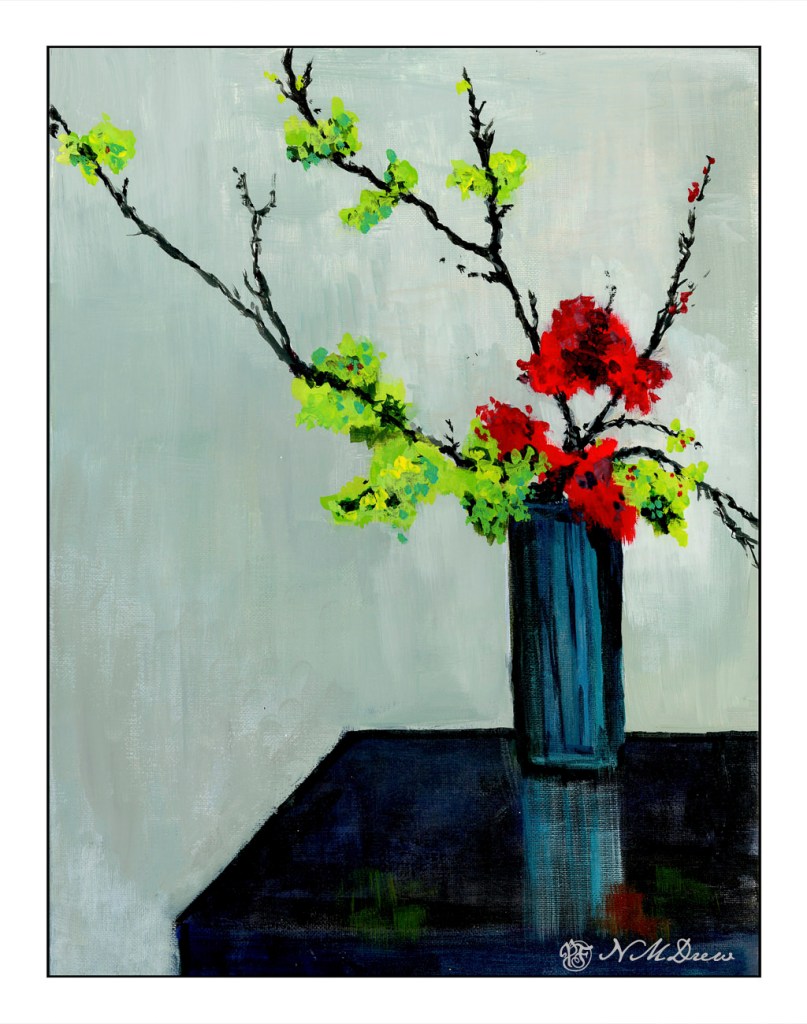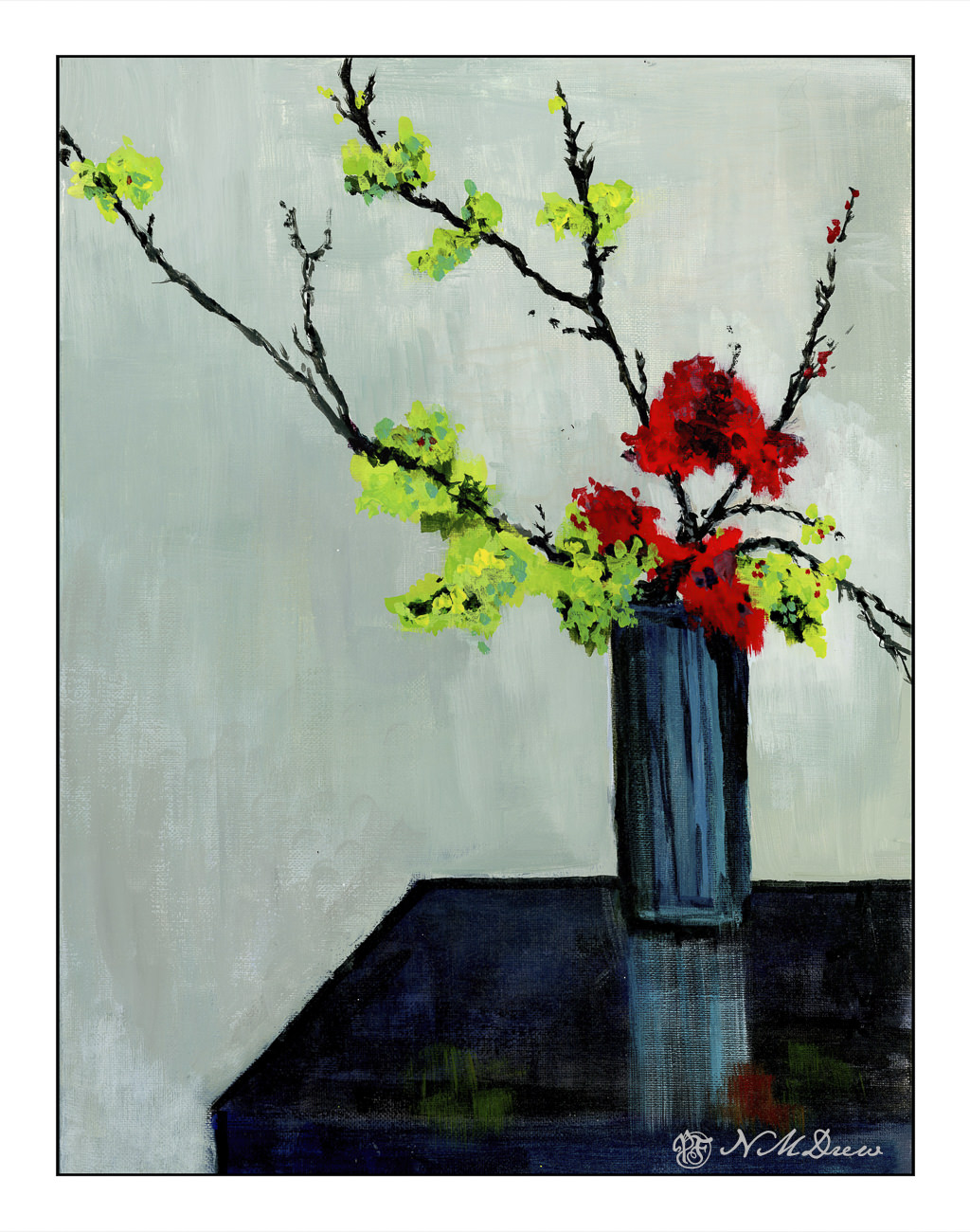 So, a bouquet. I am not totally sure if this painting is a “success” or not. Parts of it seem a bit peculiar once I see the painting as a scan. I like the window and green that is beyond the glass, as well as the window frame itself. The flowers are decent, but perhaps need more contrast and drama. The glass bowl is also okay. However, the “shadow” area in the lower left seems to not quite belong.