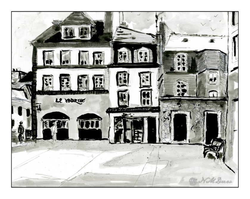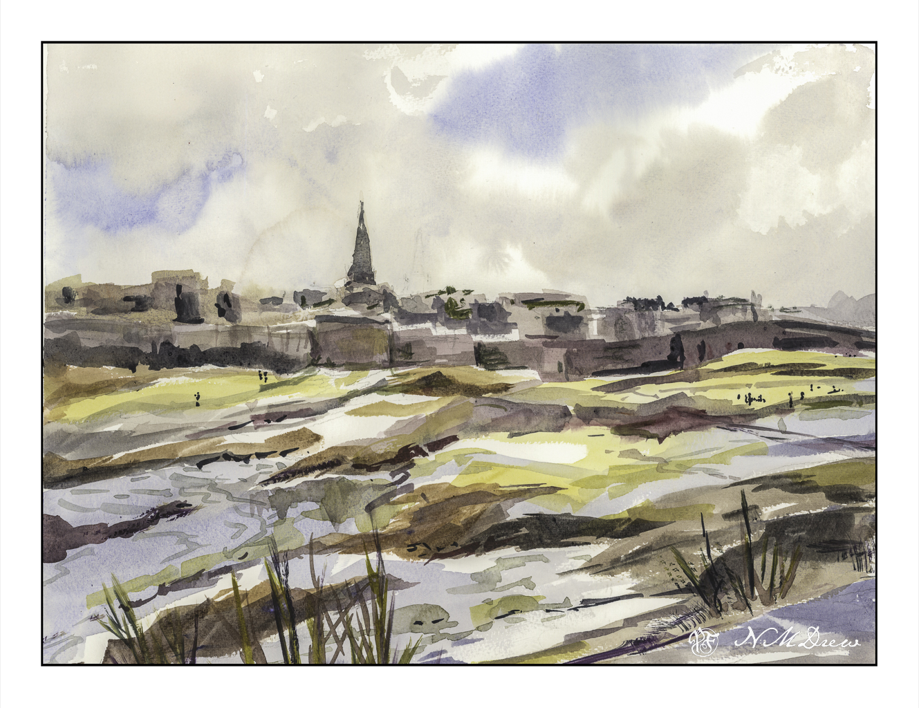 My own painting is more blue than Monet’s, but I saw a lot of blue in my reaction to his painting. Comparing the two is really interesting when I compare my scan to the Wikimedia online image presented here. It is hard work to get a good, warm grey and I did struggle with it. I also had to work on observing little things, such as the boats on the left middle edge – I couldn’t figure them out initially. The chimneys on the horizon also needed to be considered – what were they? The smoke on the left horizon gave it away. Once I had the boats on the left sorted, the vertical lines reflected in the water made a lot of sense.