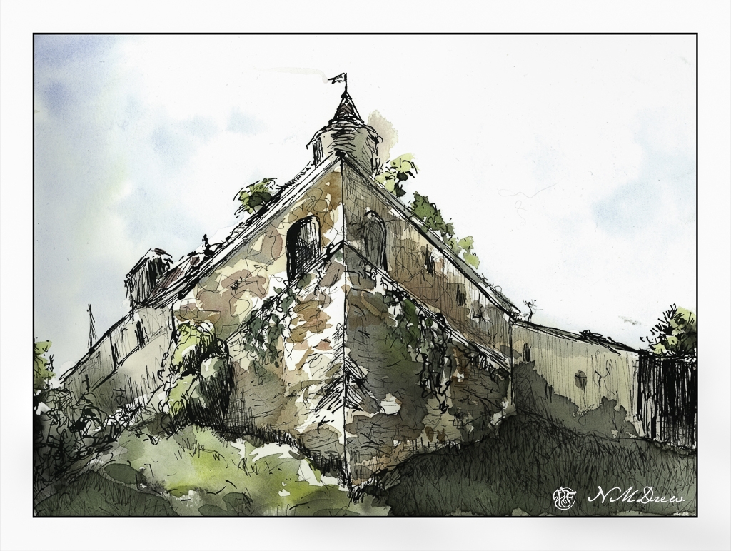 I travel the globe through watching videos, photo websites, and royalty-free images. This time I visited someplace in France, searching Pixabay for photos matching the term “citadel” and found some really interesting things. What I wanted in particular were photos with strong architectural details and perspective to use as practice for drawing / painting buildings. The one I used in the painting below was taken from a low vantage point and looking upward. The upper reaches of the tower were centered over the corner of the citadel, and the sides of the citadel sloped steeply downward.
