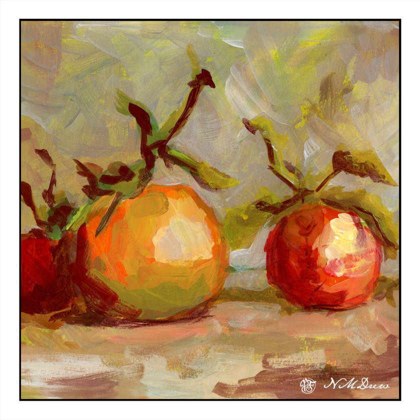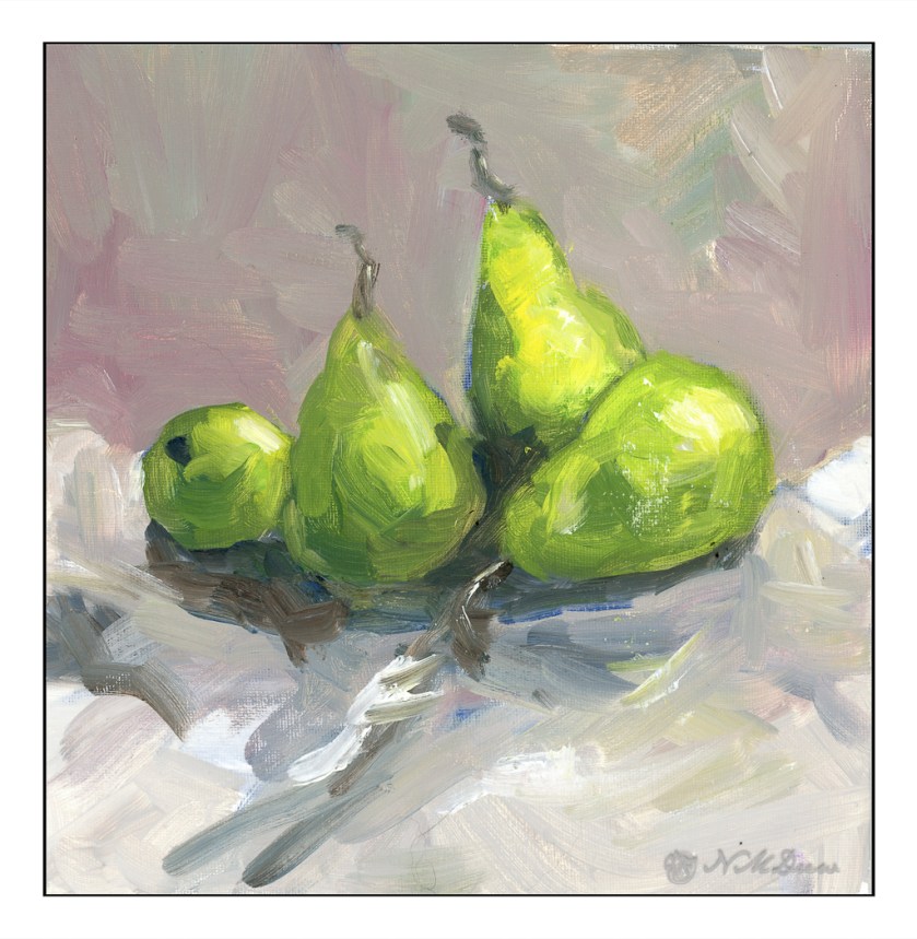 I love pears! Painting them is far less tasty than eating them, but they are by far one of my favorite winter fruits. Here, some d’Anjous, all cuddled together. My focus here was brushwork and getting a sense of the unctuous quality of oil paints. Some people use the paints straight out of the tube, but I like mine to slide around a bit. It really makes for fun blending. The colors, too, were rather limited here for the purpose of seeing how they can interact.