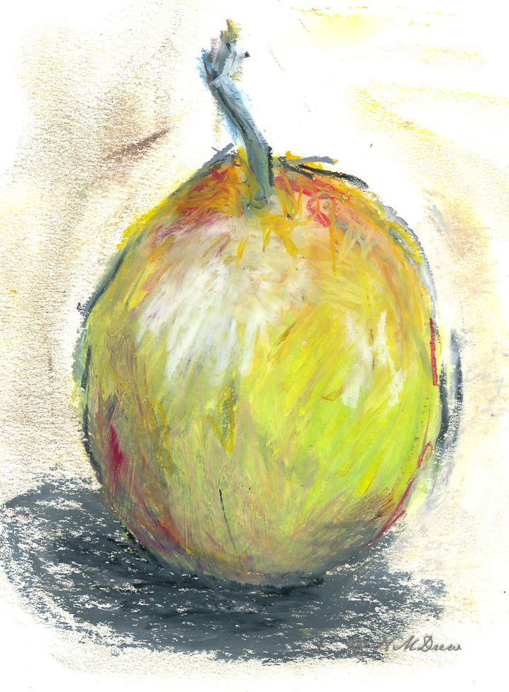 Ugh! I was in a rather bad mood today – you know how it is sometimes – so I decided to just play with oil pastels. Nothing great, but the fact is, drawing and such can be very soothing and change perspectives. So, I sat outside on the patio, a tablet of small, meh paper, and the different packages of the oil pastels. I decided to draw fruit. And there we are, about 3 hours later, with the following pear and two apples.