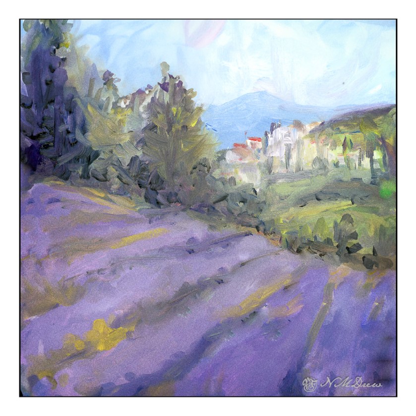 Here, more lavender fields. Why so many? It is because lavender and purple are honestly rather nasty colors to create from the standard mixes. I find that I like to have “convenience colors” on hand – namely, a good violet such as carbazole or dioxazine. Mixed with other colors and / or white, I get lavenders and such that appeal to me. I initially tried to just use variants of red, blue, and white for the lavenders, but gave up with frustration. Not worth the sweat! Maybe later I will master a good orchid lavender, but for now . . .
