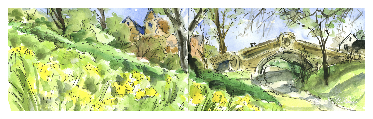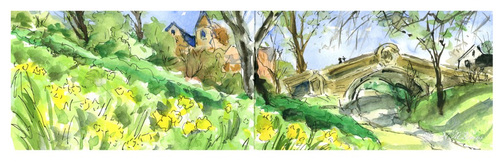 With all this work, there has been little time for sketching or painting. Thus I decided, much like my “Not Taken Vacation” that a sketchbook dedicated to this year’s gardening efforts would be fun to do. I have a fanfold Chinese calligraphy book I am using. It is a fanfold, so I can spread it out if I want to create a panorama, or use individual pages.