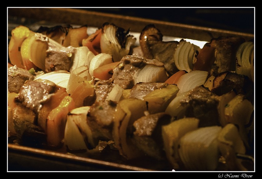 Preheat broiler.  Prepare 3-4 metal skewers with alternating peppers, onion, and tuna.  Spray with oil.  Broil about 5 inches from broiler, turning about every 3-4 minutes until cooked as desired.