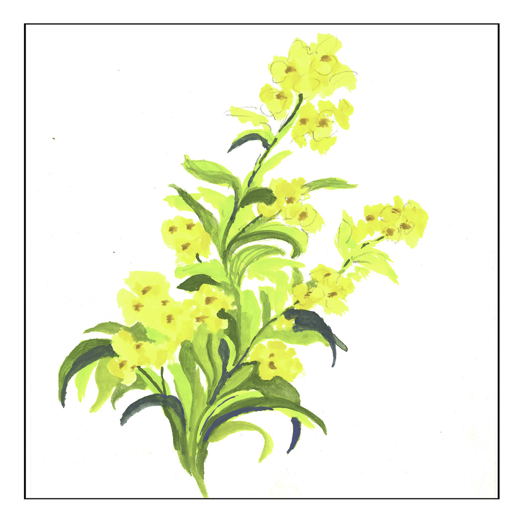 My first picture was quite tentative, but eventually I got a bit more brave. Sadly, the scanner did not differentiate very well between the yellows in the flowers. Rather than just one color, I used both to suggest petals. The greens are straight out of the tube as well as mixed with blue and black.