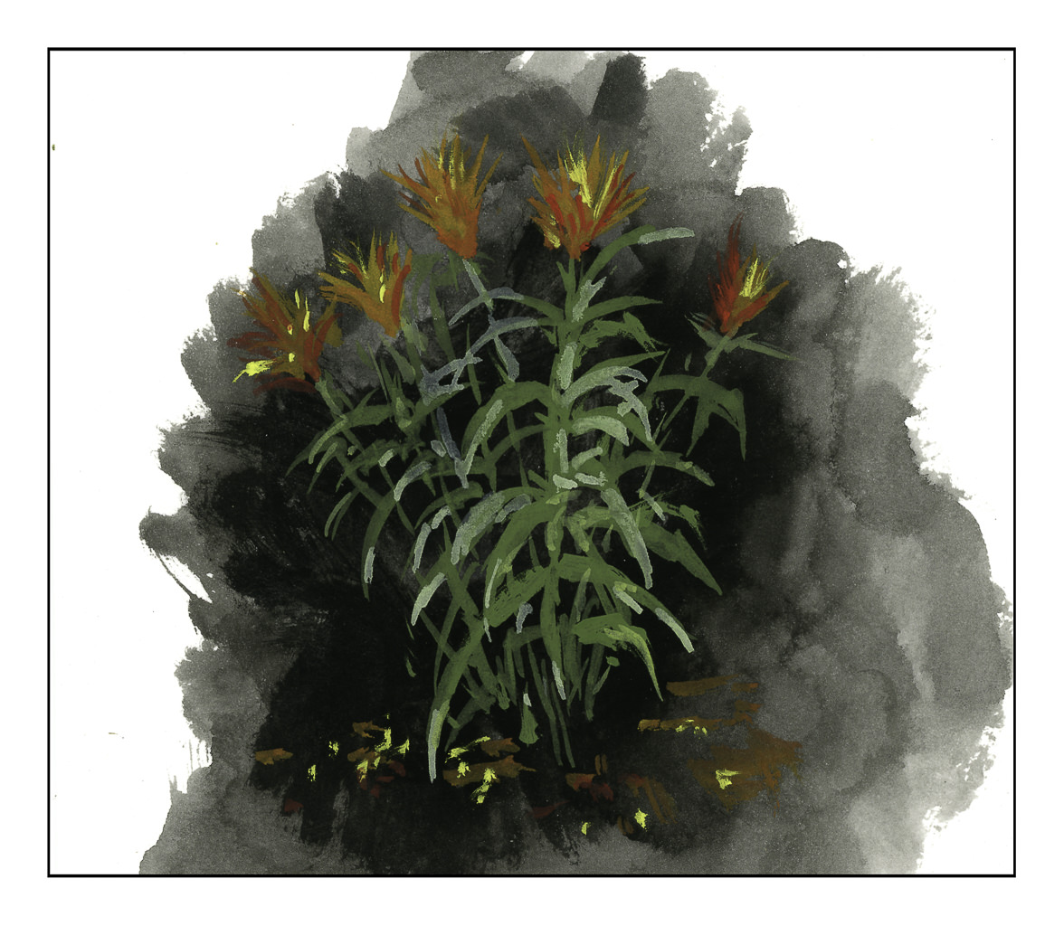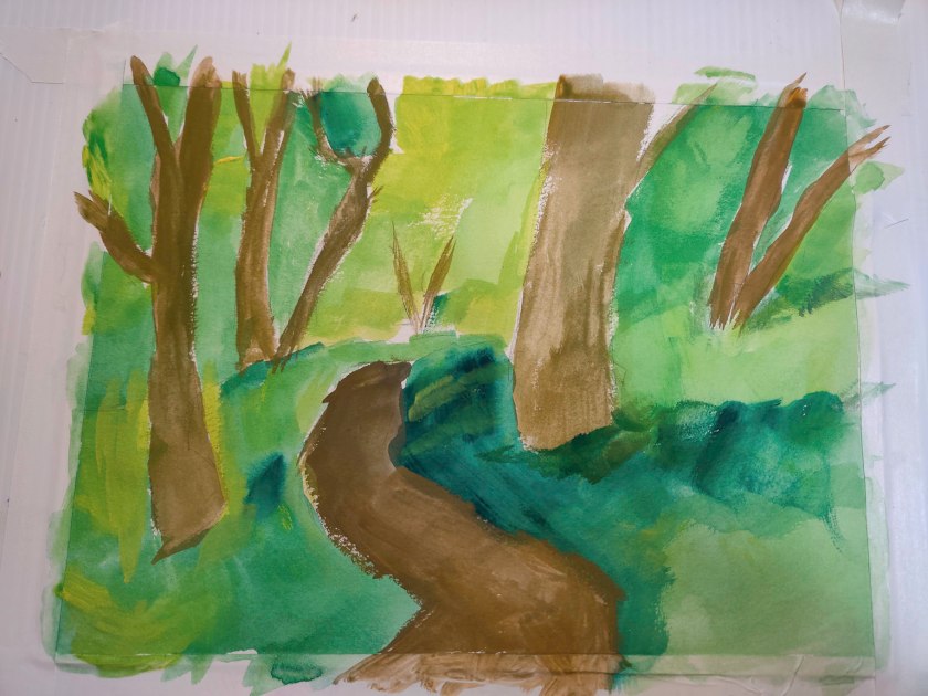 Finally, I remembered that gouache suggests painting dark to light. Here I placed a black/blue mixture and let it dry. From there, I applied moss green, but I should have mixed it and the yellows and reds with white so they would dry brighter. Still, that is a good lesson for the future:. Darks in gouache dry lighter, and lights dry darker. Here I applied paint directly and let it dry, as well as mixing it on the paper.