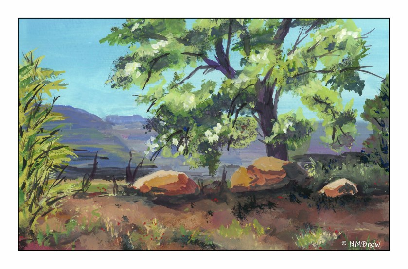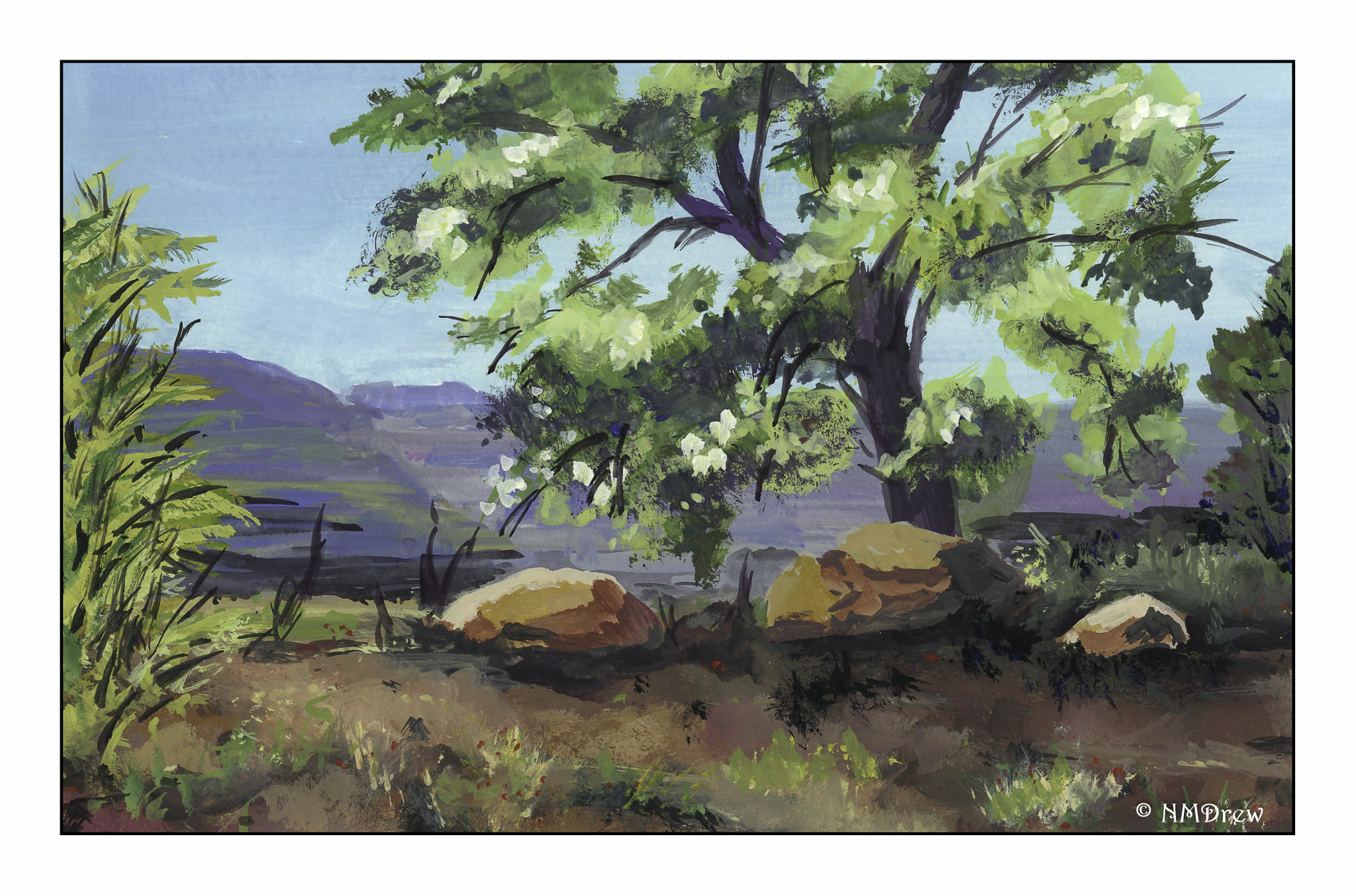 This painting is done from a photograph I took on the edge of the Grand Canyon. Our B&B host gave us exact directions to a dirt service road, complete with mile marker. There was a little turnout for parking and an easy mile walk through the pines. At the end, the edge of the world! Before us spread out the incredible vistas of the Grand Canyon. The edge, though, before we met that vast expanse, had a wonderful scene of its own – trees, flowers, bushes, rocks – through which a hint of the Grand Canyon could be seen.