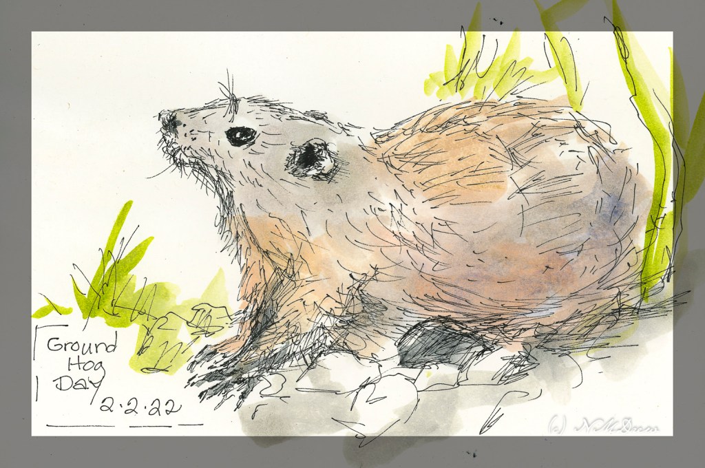 One of the beauties of drawing is you can create anything you want. This is a ground hog, but one I invented. I invented him when I realized his ear is all cockamamy. So, new subspecies: the Lopso-Eared Ground Hog.