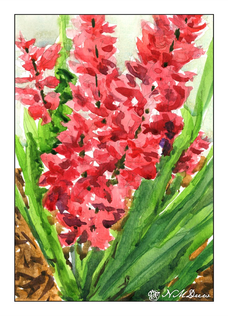 These hyacinths are not as appealing to me as the pink-red ones (which could be gladioli, too!), but the paper is. The paper is extra white Fabriano 100% cotton 140# CP paper. It connects with the paint more readily and there is a sense of contact and control that I don’t feel with the ArtBeek. This same feeling comes with Arches and Kilimanjaro (from Cheap Joe) watercolor papers.