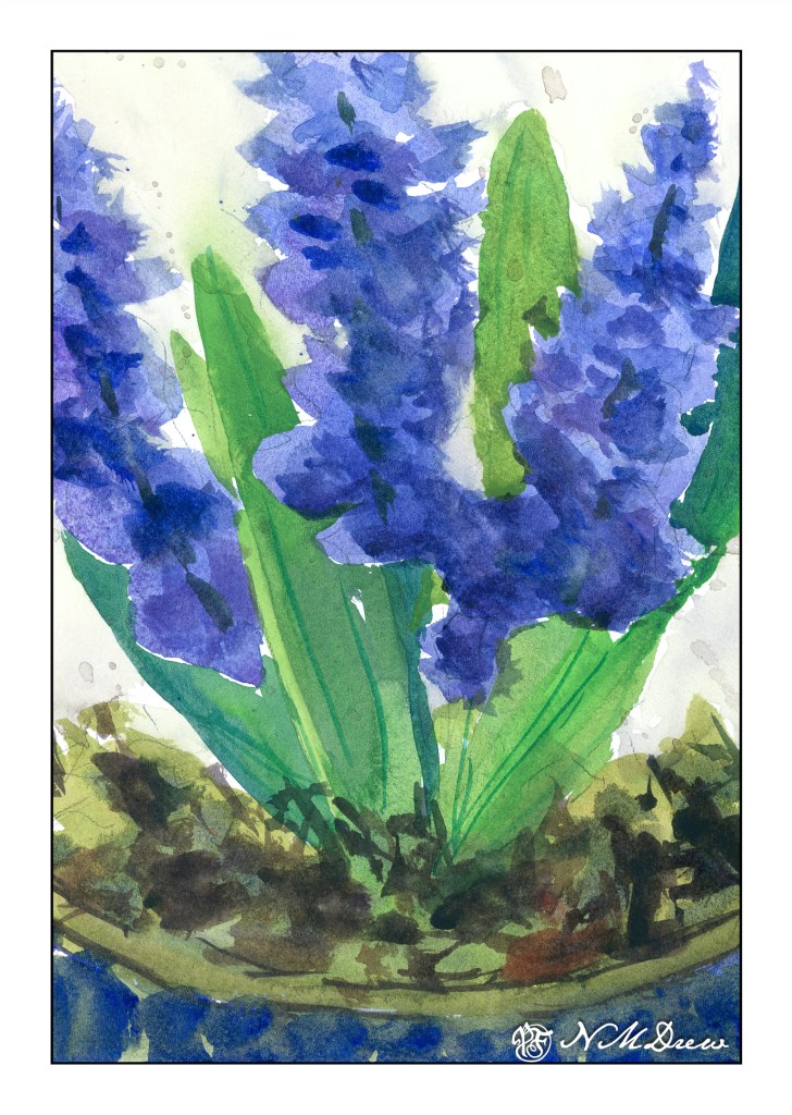 The solstice is not yet here, so it is still technically Spring! I thought this was an important fact since I am showing off the hyacinth study from Shari Blaukopf’s online course of flowers in the spring. I already did the crocus – the flower I have never seen – and today I present you with the second study, hyacinths.