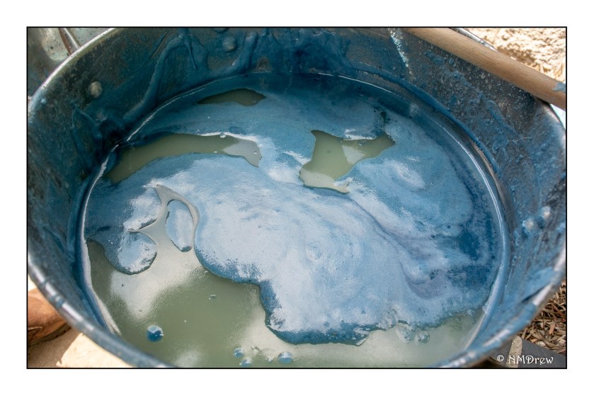 After several dippings and stirrings, the fabric was removed from the 4-gallon kettle. Wax and murky water remained behind. You can see the liquid wax on the top of the water, and the hardened wax on the sides of the pot. It is interesting to note that the water has a greenish cast – water when you are dyeing indigo is also green. The blue color of indigo does not occur until the fabric or yarn is pulled out of the dye bath and exposed to oxygen.