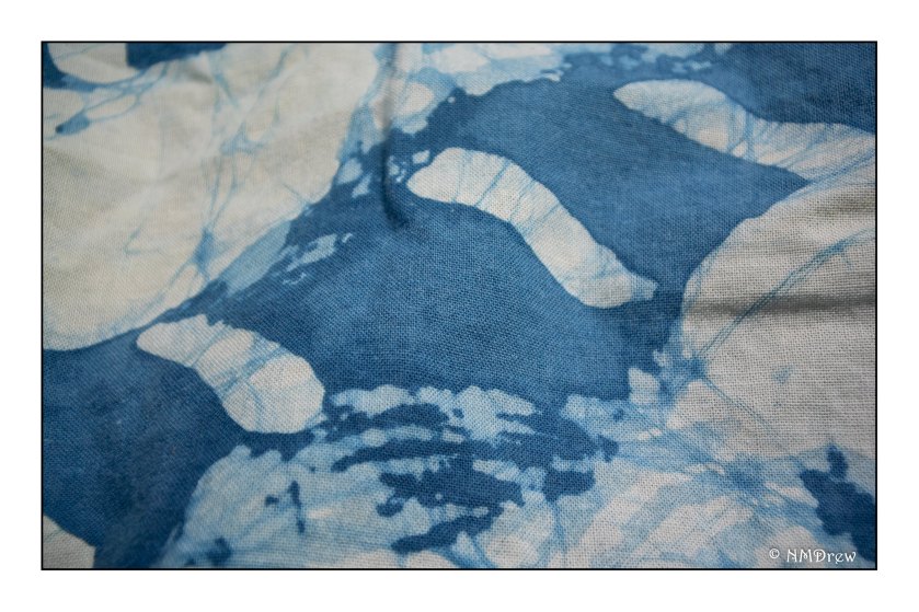 A close up shows how the wax cracks and the dye seeps in, as well as how it colors areas with less wax. The thicker the wax, the less likely the indigo or dye is to seep in. Because the wax was thickly applied, cracks easily develop. Areas where thinner wax is applied and not worked into the fibers are more likely to take some dye, albeit less intensely.