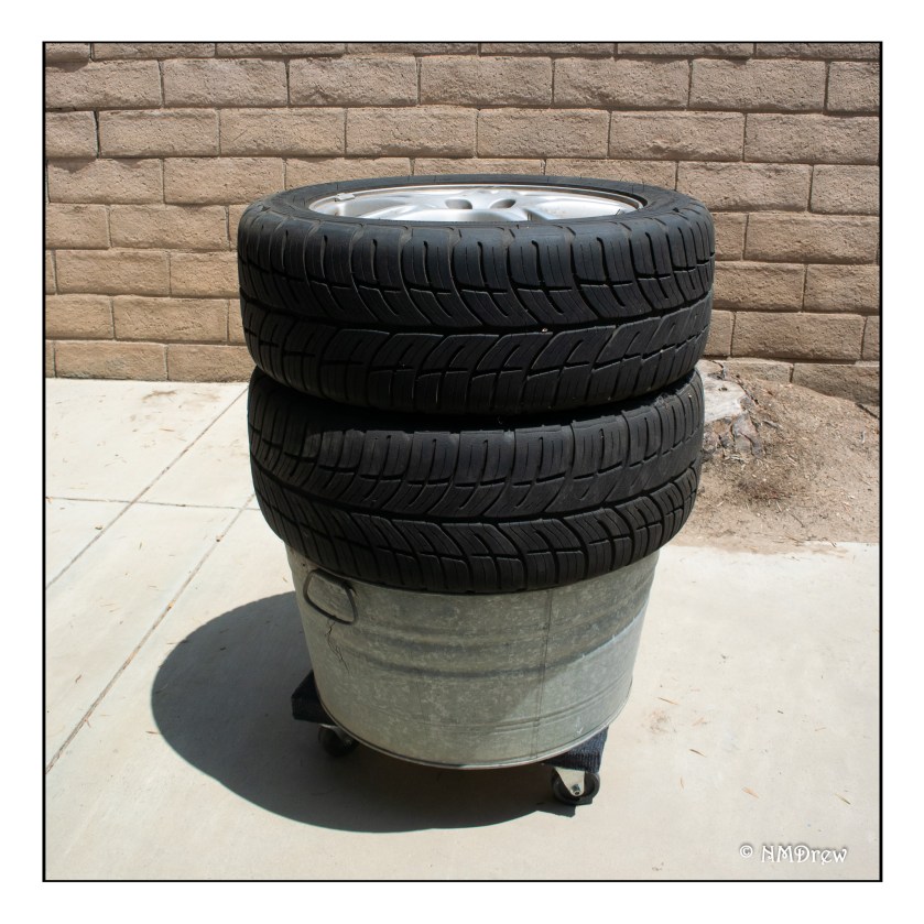The fabric wanted to float to the surface of the water, even after squishing out the air bubbles. I stirred and lifted the fabric again, making sure to mix it all up really well in the soapy water. Interestingly, no suds developed. Before sealing it to cool, I weighted the fabric down in the tub with some bricks to ensure it did not rise to the surface and collect any wax which had been removed. Then, we sealed if for the night! We used the wheels from the donor WRX. Our goofy dogs wanted to taste the soapy water, and I wasn’t inclined to let them indulge.