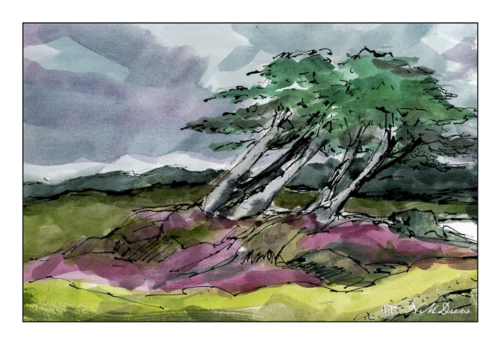 I did a quick sketch in pencil, just to get the general shapes of the trees and the land. I put in the tree trunks first as I wanted to be sure I knew their placement along the land. I used a mixture of blacks and greys, pale to dark, but initially light to indicate placement. From there, the foliage and the land. Once established, detail began, with dry brush strokes for vegetation and later for the leaves on the cypress. More than anything, I wanted a loose, windswept look with a sense of direction and sky.