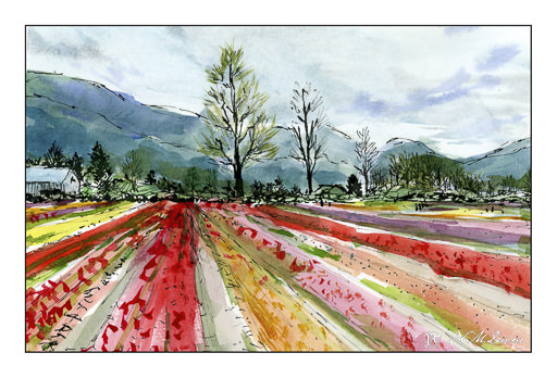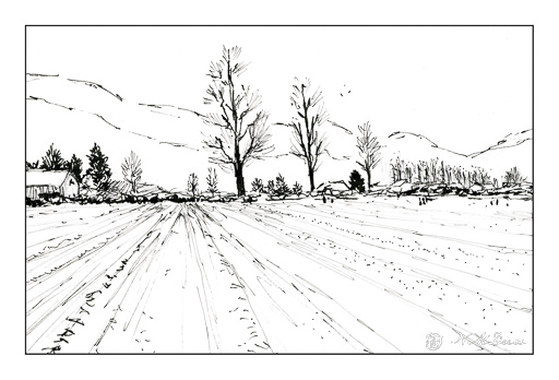 Planning a loose painting takes a bit of forethought. I put in the tree trunks first, then some foliage and land. The sky was done after all these with a large, soft flat watercolor brush. Final touches came after all was dry. I made this into a panorama, spanning 2 pages of my sketchbook, to give a sense of expanse. In the end, I was rather pleased with this.