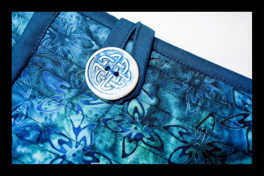 The bag comes in three sizes – small, medium, large. The small is tiny, perfect for little gifts and using up scraps of fabric. I made the medium size. The large is a bit bigger, but this one is a nice size to carry around. Also, I was really happy to find this ceramic Celtic knot work button in my button box – it seems perfect for the bag.