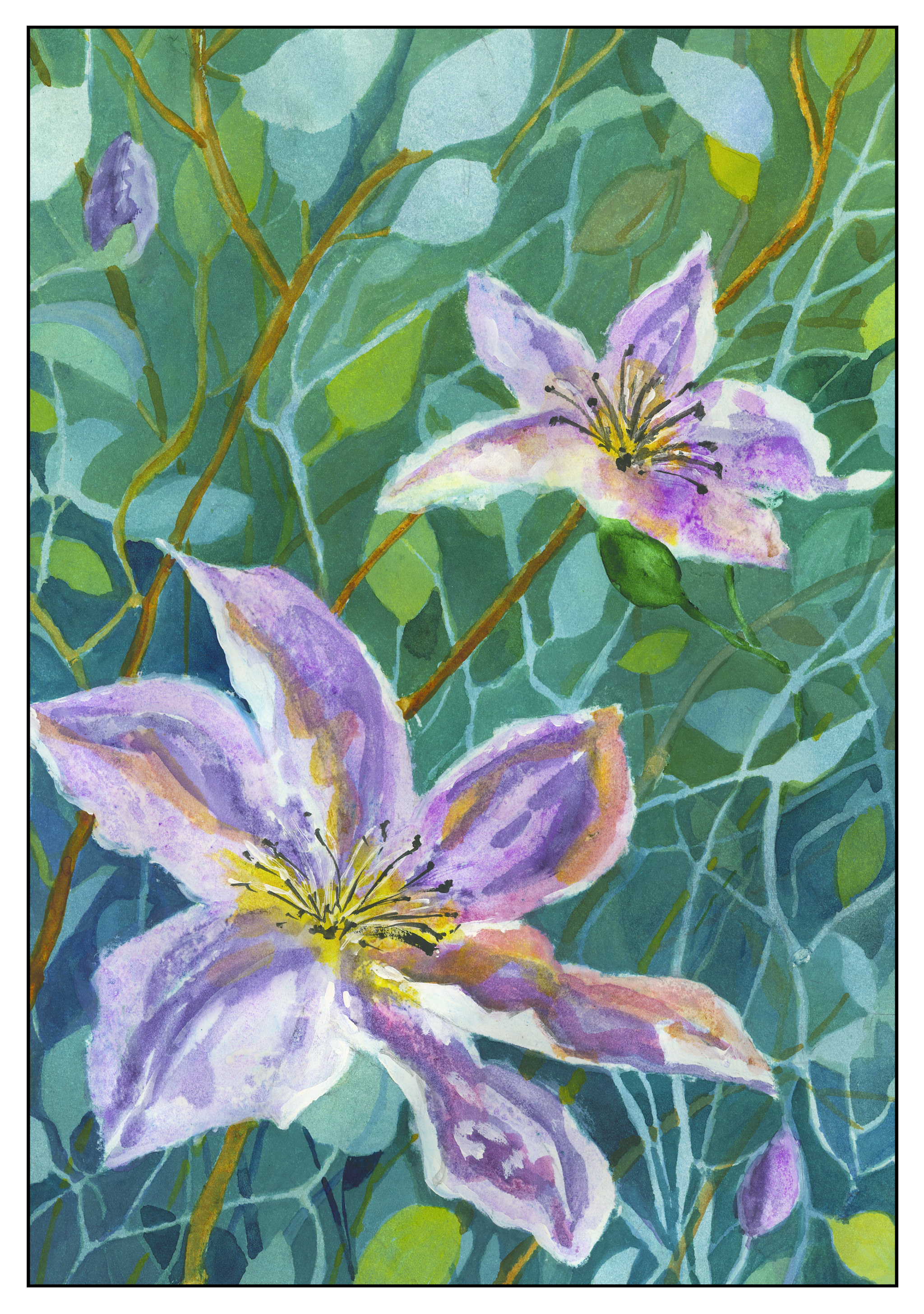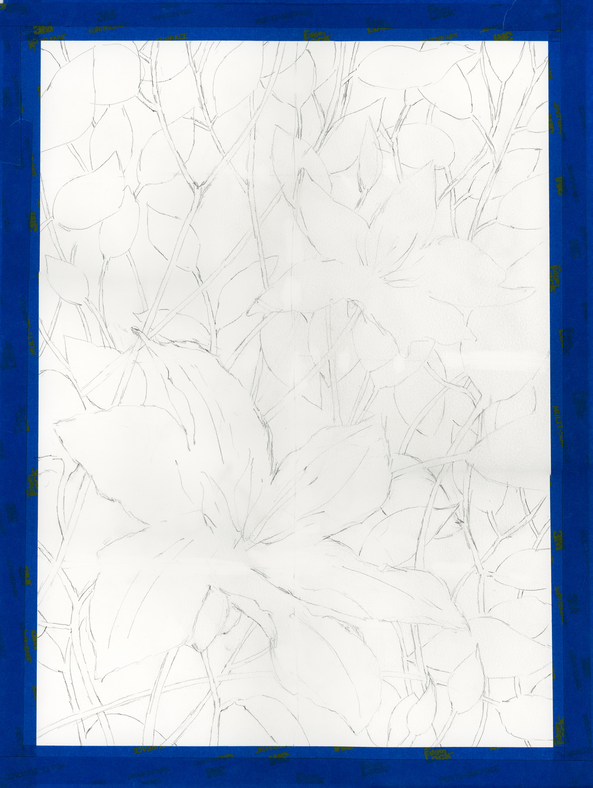 And finally, more of the orange lilies I have. This time I included the pot! I began this painting with the pale beige of the wall, creating leaf shapes by negative painting. I wanted to catch the light and sparkle on these complex plants. They are lighter at the top, and get darker as you move down and to the left. The patio is covered with light and shadow from the sun through the leaves of the overhead trees.