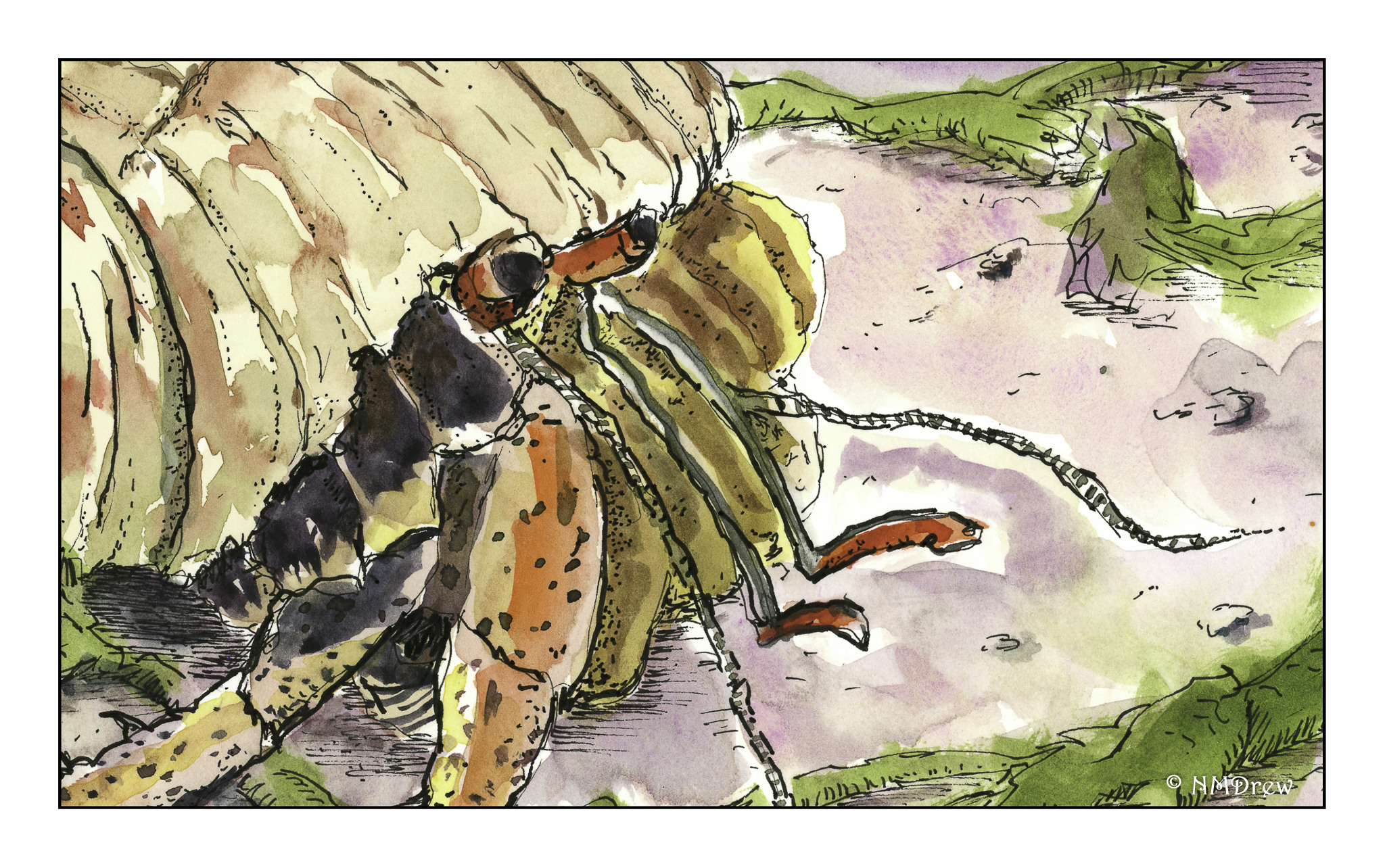 Initially I had drawn this shack so that the beach and waves in the distance were parallel to the edge of the paper. After scanning it, I realized it looked better with a bit of an angle to it. Interestingly, a comment said it made no sense because the ocean is out there, straight ahead. Obviously, too realistic of a person, or someone who hasn’t taken a photo. Really, to me, a very interesting and odd comment and viewpoint!