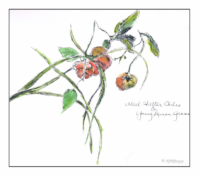 A flowerpot with a dead sunflower (left), oregano in bloom (middle), and the stalk and leaves of milkweed plant. Color applied first, dried, and then iron gall ink drawing.This last picture was an afterthought. The first drawing found the color overwhelming the ink at times, so I decided to paint first, and then draw. Artistic experiment!