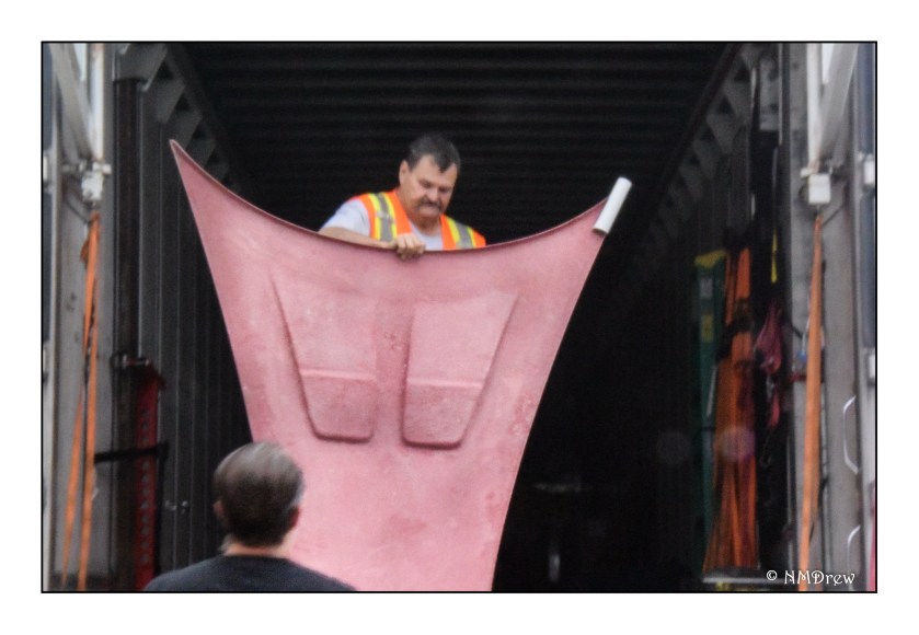 The side of the car body, hooked onto the overhead cranes, with a fender packed inside. All the guys had to hold the car steady as the fender was released from its home. It got snagged a bit on something, but Mark, Mike, Josh, Ed, and our neighbor John all got together and held it steady. I supervised, of course.