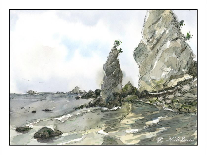The thing that amazes me about the northern Pacific beaches, ones in Oregon and Washington – as well as into Canada – are the sea stacks. They are tall rocks, worn away by wind and wave, but they are not barren. Pine trees grow on them – some have more, some have less. I think it would be a wonderful thing to live on one, in a warm cave (with running water and few other things!), to be at one with the sounds of the world . . .