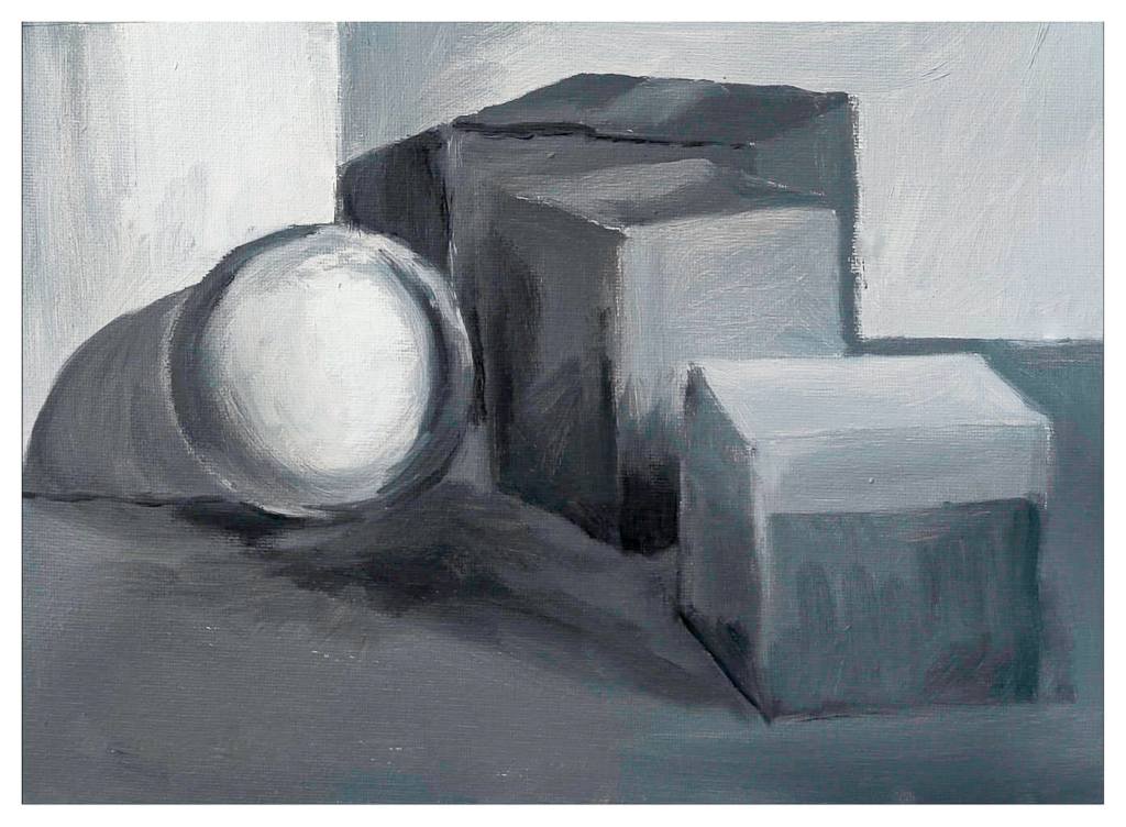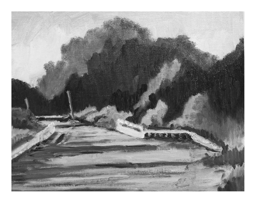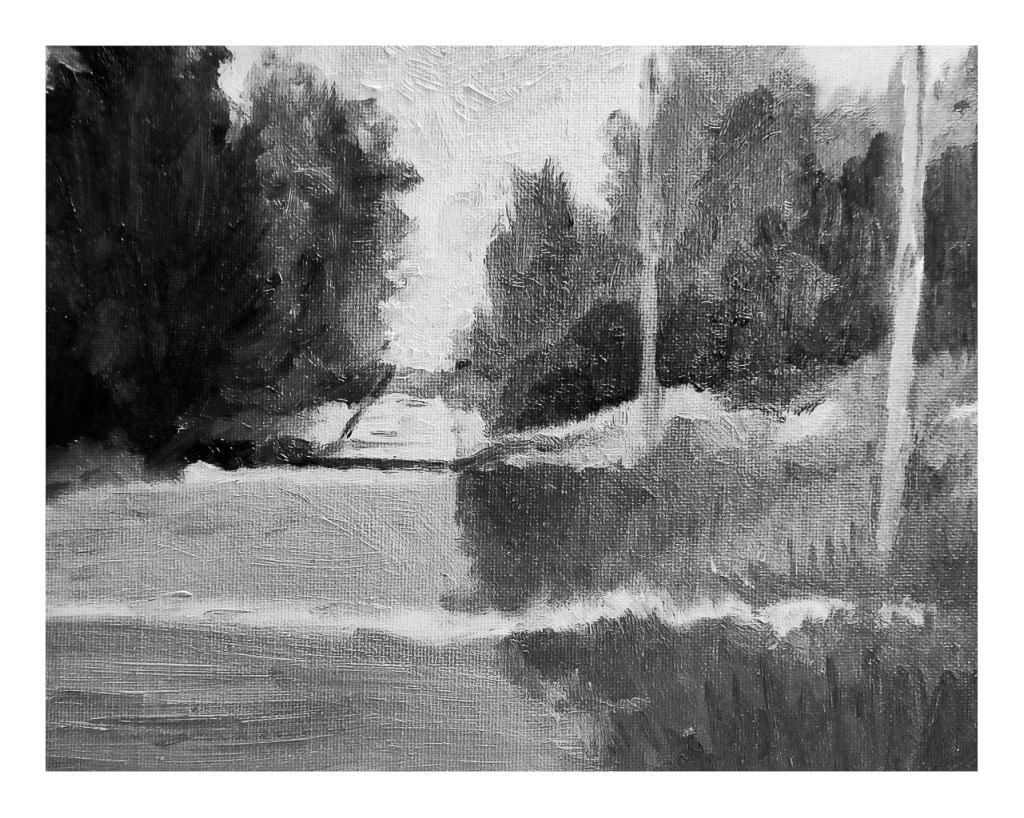 For the surface, I am using Canson’s paper for acrylic and oil paints. It has a smooth, linen-like texture and responds well. The bit of tooth is pleasant under the brush. My colors are heavy-body acrylic paints from Golden and Liquitex and are simply ivory black and titanium white.