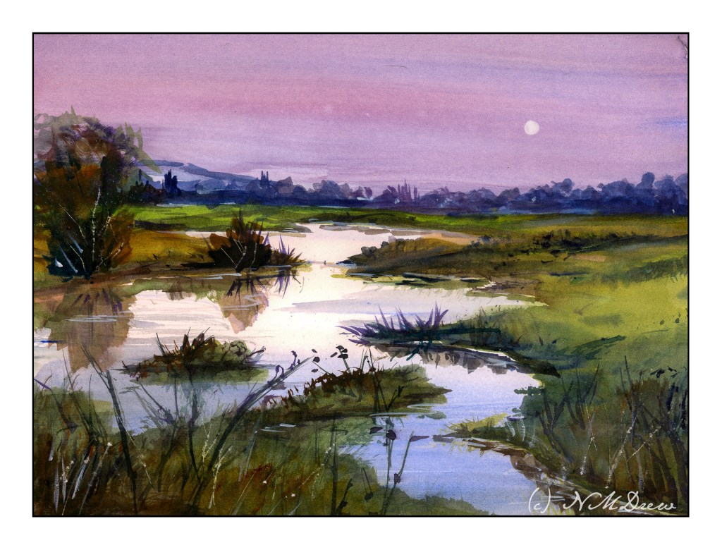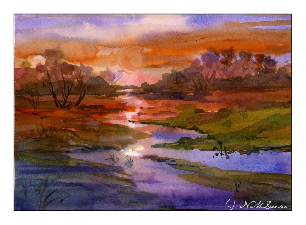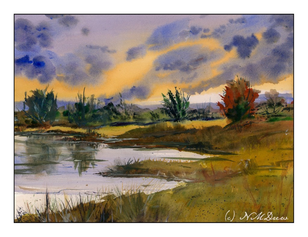 Finally, my version of one of Tabatabaei’s paintings using his water / sky technique. It worked out pretty good, I think, and I can see I am going to have a lot of fun painting water! Expect a monsoon or flood . . . of watery watercolor paintings.