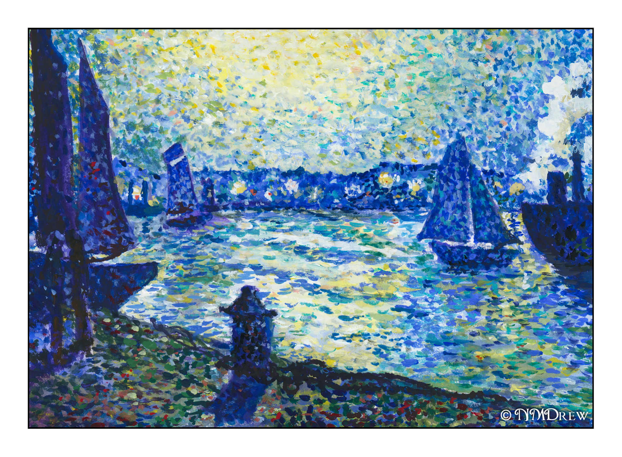 Still, sticking with Pointillism, today’s study is from a painting by Theo van Rysselberghe, a Belgian painter who does lovely work. Here, a study of a moonlit night of a harbor. Boats, sails, reflections, silhouettes, lights, and even a few human beings. Van Rysselberghe’s interpretation of the night, the light of the moon, and the colors used to express the night are so interesting. The lack of light, artificial light, and moonlight all create an atmosphere at once pleasing and rather mysterious. My own agenda has learning to paint the night effectively a high priority.