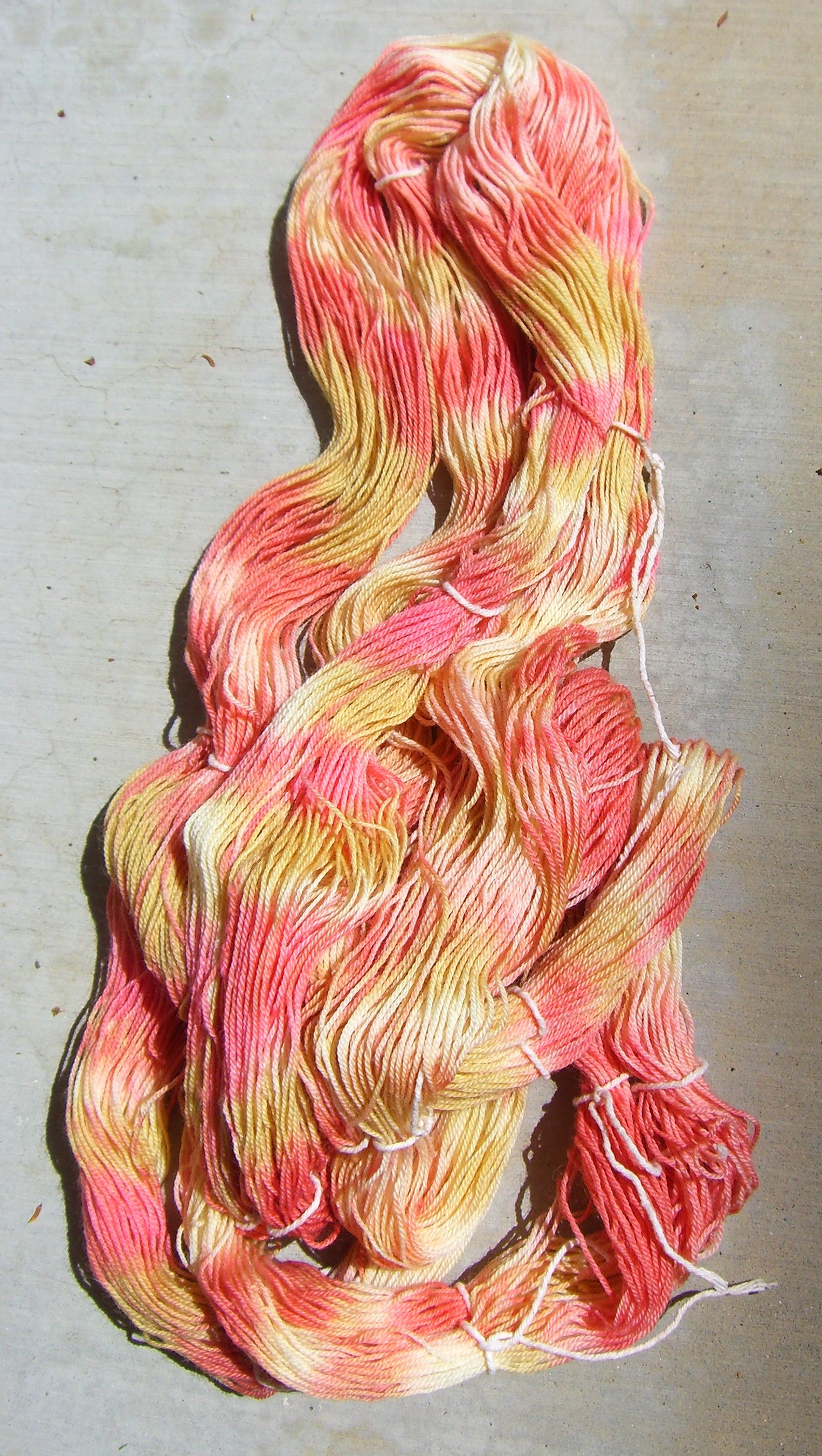 The water here in Thousand Oaks has a pH of 8. This means it has a slightly alkaline quality. The use of gypsum is to move the water closer toward pH 7, which is neutral. Ammonia is alkaline, and pushes cochineal toward the purples, and the tin in the dye bath helps to promote the red qualities of the cochineal. With the golden underdye of the quercitron, the overdye of the two exhaust baths created a color similar in tone to the gold. The result is a color variation in the yarn ranging from pale gold, to darker gold, corals and pinks.
